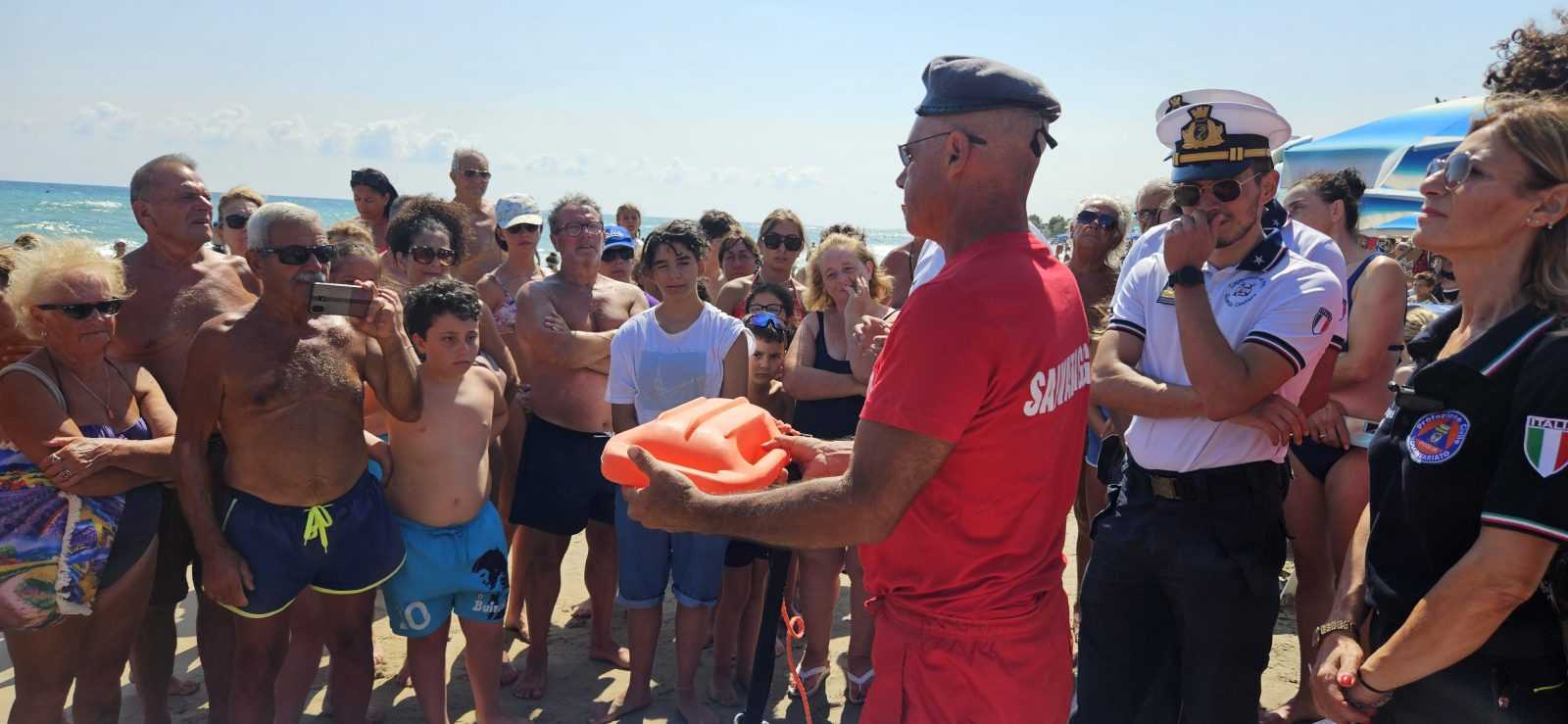 I molti bagnanti presenti hanno potuto assistere alle dimostrazioni pratiche sulla sicurezza in spiaggia, sul primo soccorso, sull’educazione ambientale per preservare i nostri mari dall’inquinamento da rifiuti e sui cambiamenti climatici.