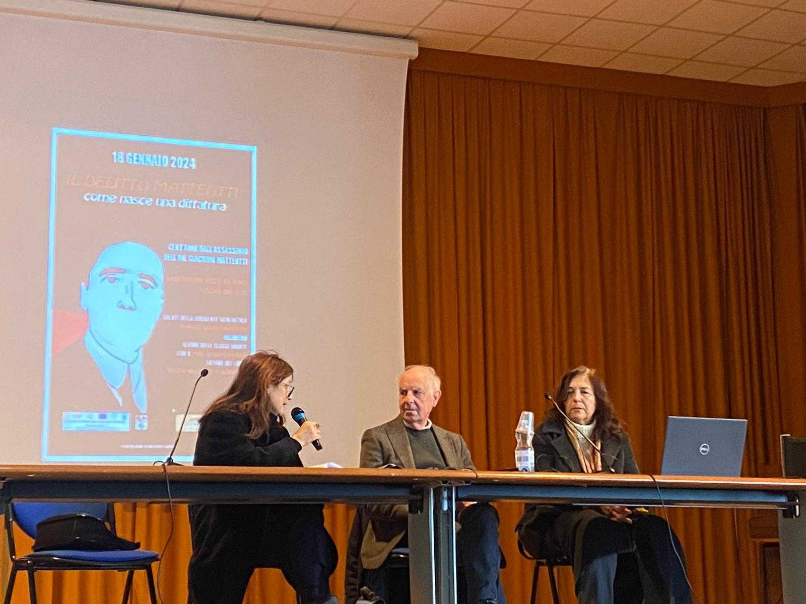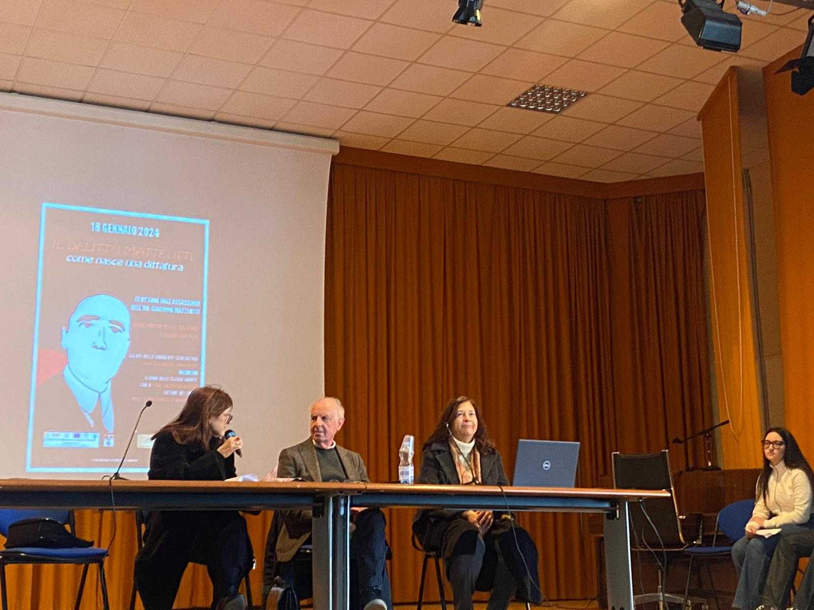 Il prof. Gianfrate ha ripercorso gli avvenimenti che precedettero e seguirono l’omicidio di Matteotti; quest’ultimo, alcuni giorni dopo aver tenuto alla Camera il celebre discorso con cui denunciava i brogli e le violenze che avevano caratterizzato le elezioni del 6 aprile 1924, venne rapito e barbaramente ucciso da alcuni sicari fascisti. Il prof. Gianfrate ha evidenziato la probabilità che questo omicidio sia stato deciso anche per impedire al segretario del PSU di rivelare, nella seduta parlamentare successiva, le prove di transazioni illecite che vedevano coinvolti Mussolini e lo stesso re Vittorio Emanuele III. Durante l’incontro è stato proiettato un video tratto dal film di Florestano Vancini, “Il delitto Matteotti”, mentre gli alunni Emanuele Ferrara e Arianna Bongiorno hanno letto due lettere di Giacomo Matteotti e di sua moglie Velia.