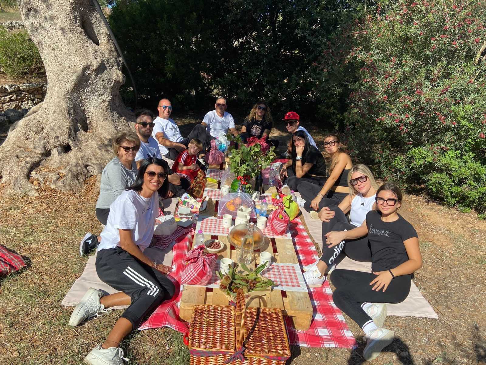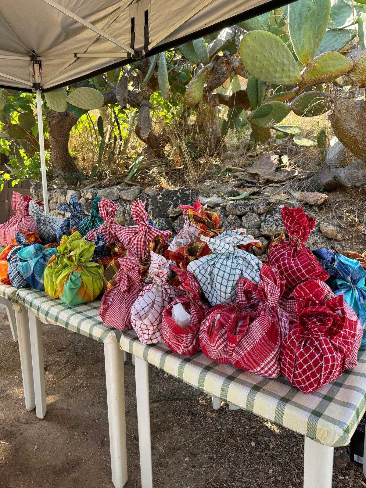 Ai partecipanti è stato fornito un “pacco” alimentare per picnic confezionato nel tipico “strofinaccio da cucina” da consumare insieme sotto gli ulivi della splendida lama.