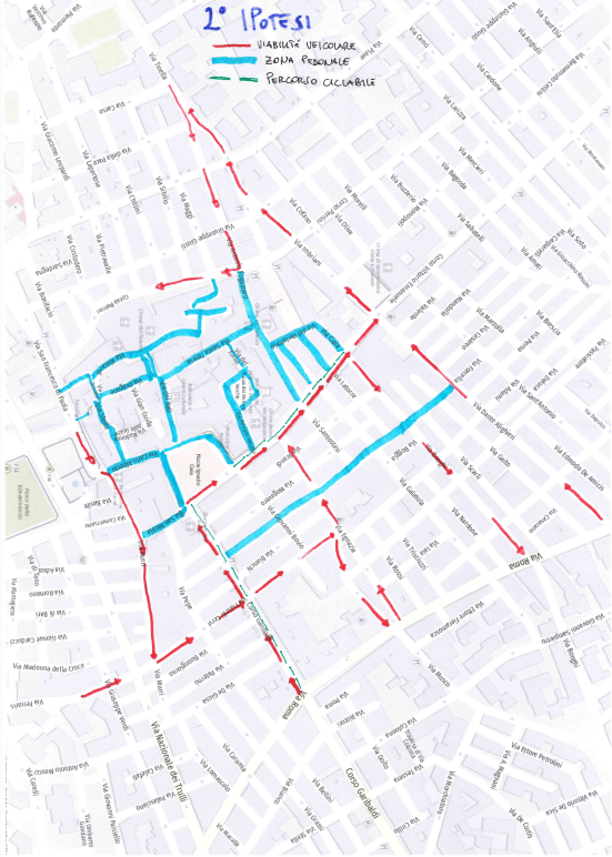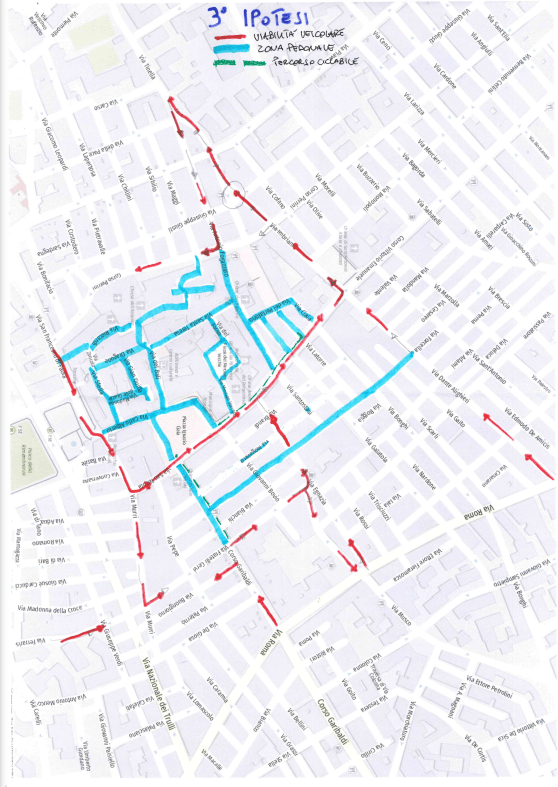 La terza ipotesi, ricalca in parte la prima, cioè la pedonalizzazione di corso Garibaldi e la viabilità veicolare come descritta nel n.1, ma con la variante di lasciare transitabile alle auto via s. Nicola e corso V. Emanuele,con la previsione su quest’ultimo, per tutto il tratto che va dalla Piazza a via Latorre, di un percorso ciclabile.