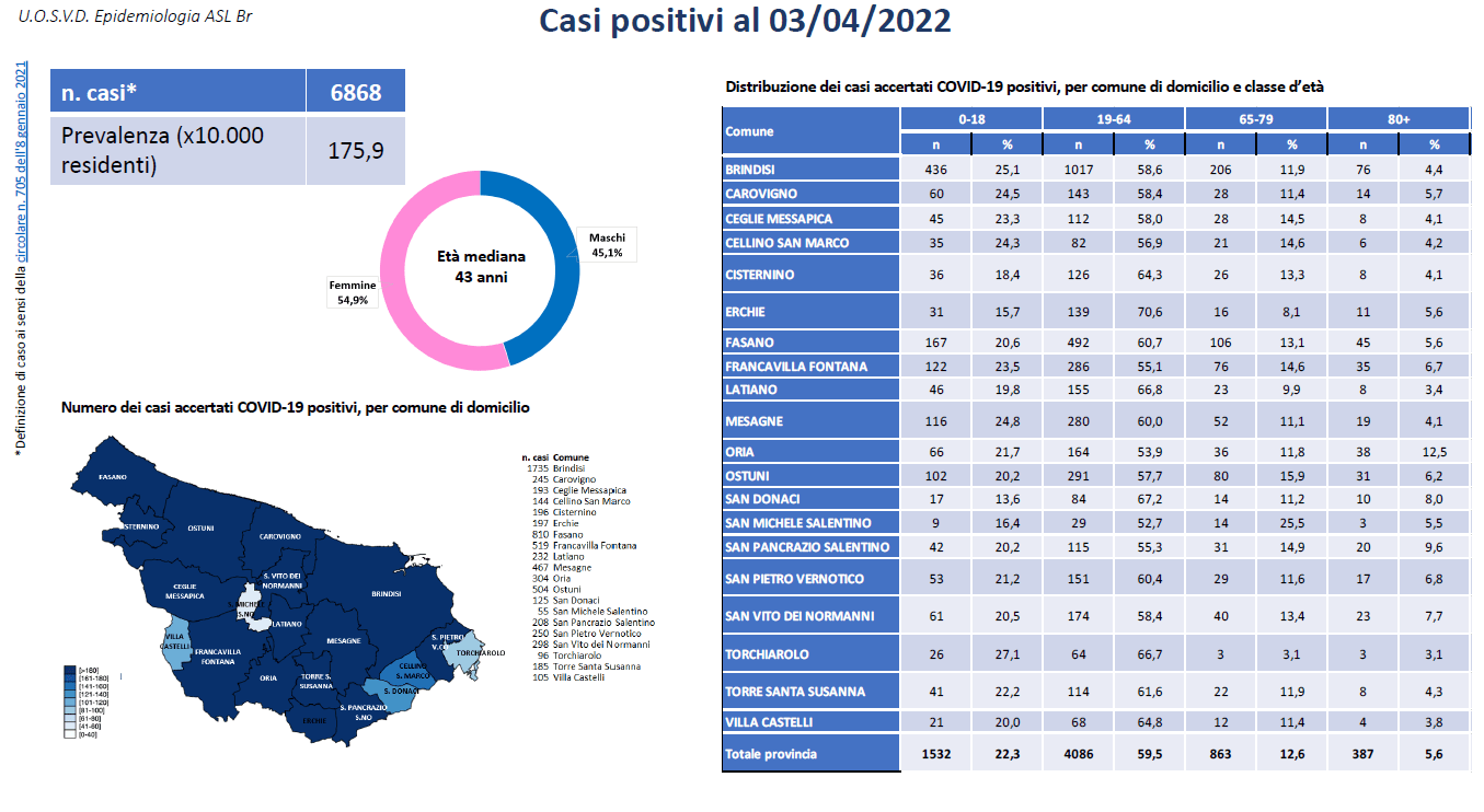 Per quanto riguarda la distribuzione per Comune i positivi sono 1.735 a Brindisi, 810 a Fasano, 519 Francavilla Fontana, 504 a Ostuni, 467 a Mesagne, 304 a Oria, 298 a San Vito dei Normanni, 250 a San Pietro Vernotico, 245 a Carovigno, 232 a Latiano, 208 a San Pancrazio Salentino, 197 a Erchie, 196 a Cisternino, 193 a Ceglie Messapica, 185 a Torre Santa Susanna, 144 a Cellino San Marco, 125 a San Donaci, 105 a Villa Castelli, 96 a Torchiarolo, 55 a San Michele Salentino. I Comuni della provincia di Brindisi con i maggiori valori di incidenza cumulativa sono, nell’ordine, Torchiarolo, Brindisi, Oria, Cellino San Marco.