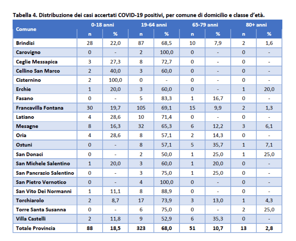 Per quanto riguarda la distribuzione per Comune i positivi sono 152 a Francavilla Fontana, 127 a Brindisi, 49 a Mesagne, 23 a Torchiarolo, 17 a Villa Castelli, 14 a Latiano, 14 a Oria, 14 a Ostuni, 11 a Ceglie Messapica, 9 a San Vito dei Normanni, 8 a Torre Santa Susanna, 6 a Fasano, 5 a Cellino San Marco, 5 a Erchie, 5 a San Michele Salentino, 4 a San Donaci, 4 a San Pancrazio Salentino, 4 a San Pietro Vernotico, 2 a Carovigno, 2 a Cisternino. I Comuni della provincia di Brindisi con i maggiori valori di incidenza cumulativa sono, nell’ordine, Torre Santa Susanna, Brindisi, Francavilla Fontana, Oria, Ceglie Messapica.