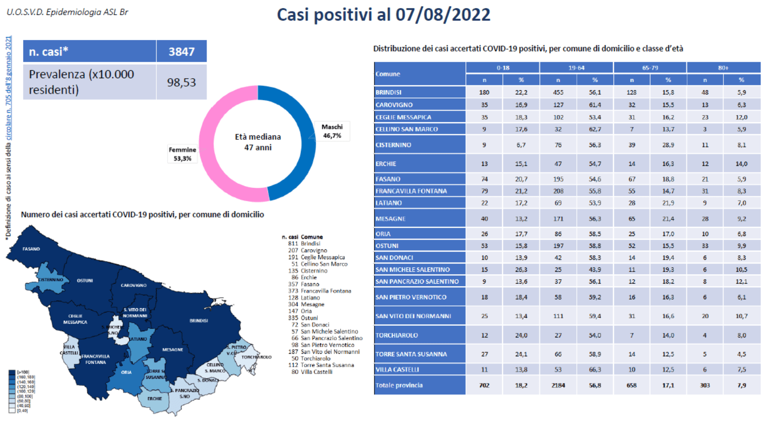 Per quanto riguarda la distribuzione per Comune i positivi sono 811 a Brindisi, 373 a Francavilla Fontana, 357 a Fasano, 335 a Ostuni, 304 a Mesagne, 207 a Carovigno, 191 a Ceglie Messapica, 187 a San Vito dei Normanni, 147 a Oria, 135 a Cisternino, 128 a Latiano, 112 a Torre Santa Susanna, 98 a San Pietro Vernotico, 86 a Erchie, 80 a Villa Castelli, 72 a San Donaci, 66 a San Pancrazio Salentino, 57 a San Michele Salentino, 51 a Cellino San Marco, 50 a Torchiarolo. I Comuni della provincia di Brindisi con i maggiori valori di incidenza cumulativa sono, nell’ordine, Torchiarolo, Oria, Brindisi, Cellino San Marco.