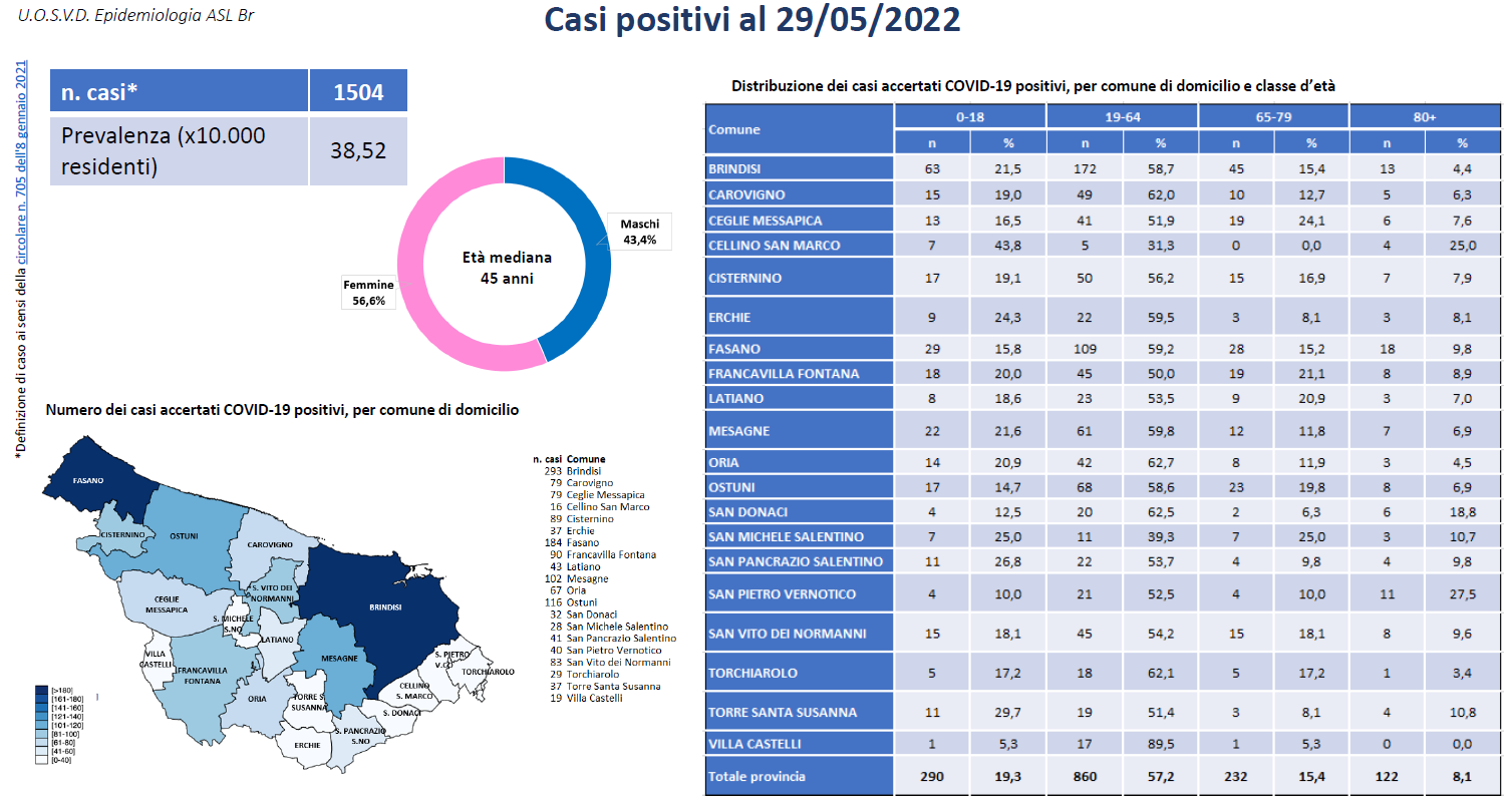 Per quanto riguarda la distribuzione per Comune i positivi sono 293 a Brindisi, 184 a Fasano, 116 a Ostuni, 102 a Mesagne, 90 Francavilla Fontana, 89 a Cisternino, 83 a San Vito dei Normanni, 79 a Carovigno, 79 a Ceglie Messapica, 67 a Oria, 43 a Latiano, 41 a San Pancrazio Salentino, 40 a San Pietro Vernotico, 37 a Erchie, 37 a Torre Santa Susanna, 32 a San Donaci, 29 a Torchiarolo, 28 a San Michele Salentino, 19 a Villa Castelli, 16 a Cellino San Marco. I Comuni della provincia di Brindisi con i maggiori valori di incidenza cumulativa sono, nell’ordine, Torchiarolo, Oria, Brindisi, Cellino San Marco.
