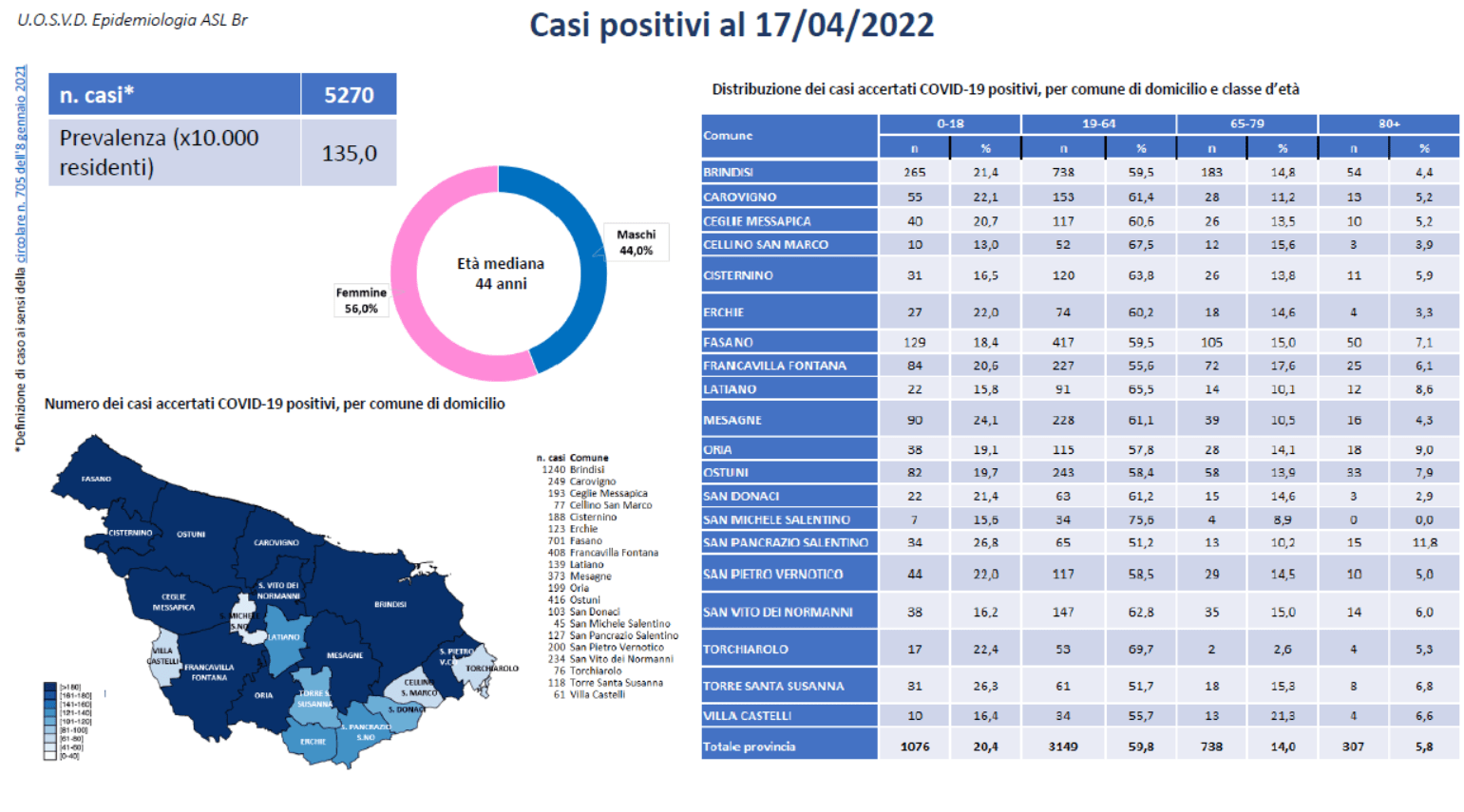 Per quanto riguarda la distribuzione per Comune i positivi sono 1.240 a Brindisi, 701 a Fasano, 416 a Ostuni, 408 Francavilla Fontana, 373 a Mesagne, 249 a Carovigno, 234 a San Vito dei Normanni, 200 a San Pietro Vernotico, 199 a Oria, 193 a Ceglie Messapica, 188 a Cisternino, 139 a Latiano, 127 a San Pancrazio Salentino, 123 a Erchie, 118 a Torre Santa Susanna, 103 a San Donaci, 77 a Cellino San Marco, 76 a Torchiarolo, 61 a Villa Castelli, 45 a San Michele Salentino. I Comuni della provincia di Brindisi con i maggiori valori di incidenza cumulativa sono, nell’ordine, Torchiarolo, Brindisi, Oria, Cellino San Marco.