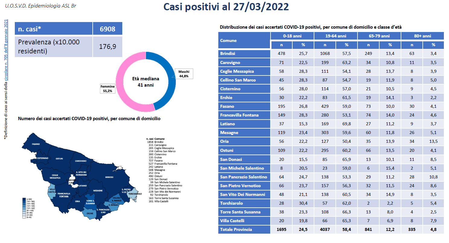 Per quanto riguarda la distribuzione per Comune i positivi sono 1858 a Brindisi, 727 a Fasano, 527 Francavilla Fontana, 508 a Mesagne, 490 a Ostuni, 315 a Carovigno, 279 a San Pietro Vernotico, 259 a San Pancrazio Salentino, 252 a Oria, 242 a Latiano, 228 a San Vito dei Normanni, 205 a Ceglie Messapica, 200 a Cisternino, 163 a Torre Santa Susanna, 159 a Cellino San Marco, 135 a Erchie, 129 a San Donaci, 101 a Villa Castelli, 92 a Torchiarolo, 39 a San Michele Salentino. I Comuni della provincia di Brindisi con i maggiori valori di incidenza cumulativa sono, nell’ordine, Torchiarolo, Brindisi, Cellino San Marco, Oria.