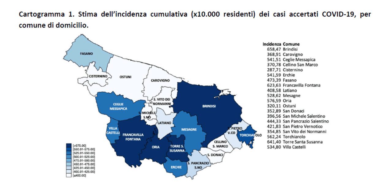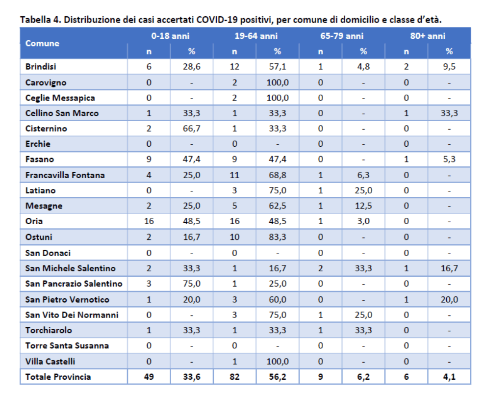 Per quanto riguarda la distribuzione per Comune i positivi sono 33 a Oria, 21 a Brindisi, 19 a Fasano, 16 a Francavilla Fontana, 12 a Ostuni, 8 a Mesagne, 6 a San Michele Salentino, 5 a San Pietro Vernotico, 4 a Latiano, 4 a San Pancrazio Salentino, 4 a San Vito dei Normanni, 3 a Cellino San Marco, 3 a Cisternino, 3 a Torchiarolo 2 a Carovigno, 2 a Ceglie Messapica, 1 a Villa Castelli, 0 a Erchie, 0 a San Donaci, 0 a Torre Santa Susanna. I Comuni della provincia di Brindisi con i maggiori valori di incidenza cumulativa sono, nell’ordine, Brindisi, Torre Santa Susanna, Francavilla Fontana, Oria.