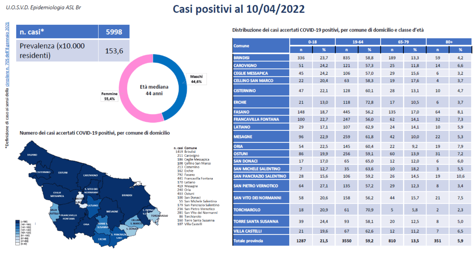 Per quanto riguarda la distribuzione per Comune i positivi sono 1.419 a Brindisi, 792 a Fasano, 441 Francavilla Fontana, 433 a Ostuni, 419 a Mesagne, 281 a San Vito dei Normanni, 240 a Oria, 236 a San Pietro Vernotico, 213 a Cisternino, 211 a Carovigno, 186 a Ceglie Messapica, 179 a San Pancrazio Salentino, 170 a Latiano, 162 a Erchie, 160 a Torre Santa Susanna, 108 a Cellino San Marco, 107 a Villa Castelli, 100 a San Donaci, 86 a Torchiarolo, 55 a San Michele Salentino. I Comuni della provincia di Brindisi con i maggiori valori di incidenza cumulativa sono, nell’ordine, Torchiarolo, Brindisi, Oria, Cellino San Marco.