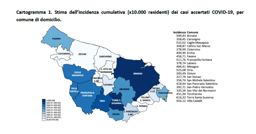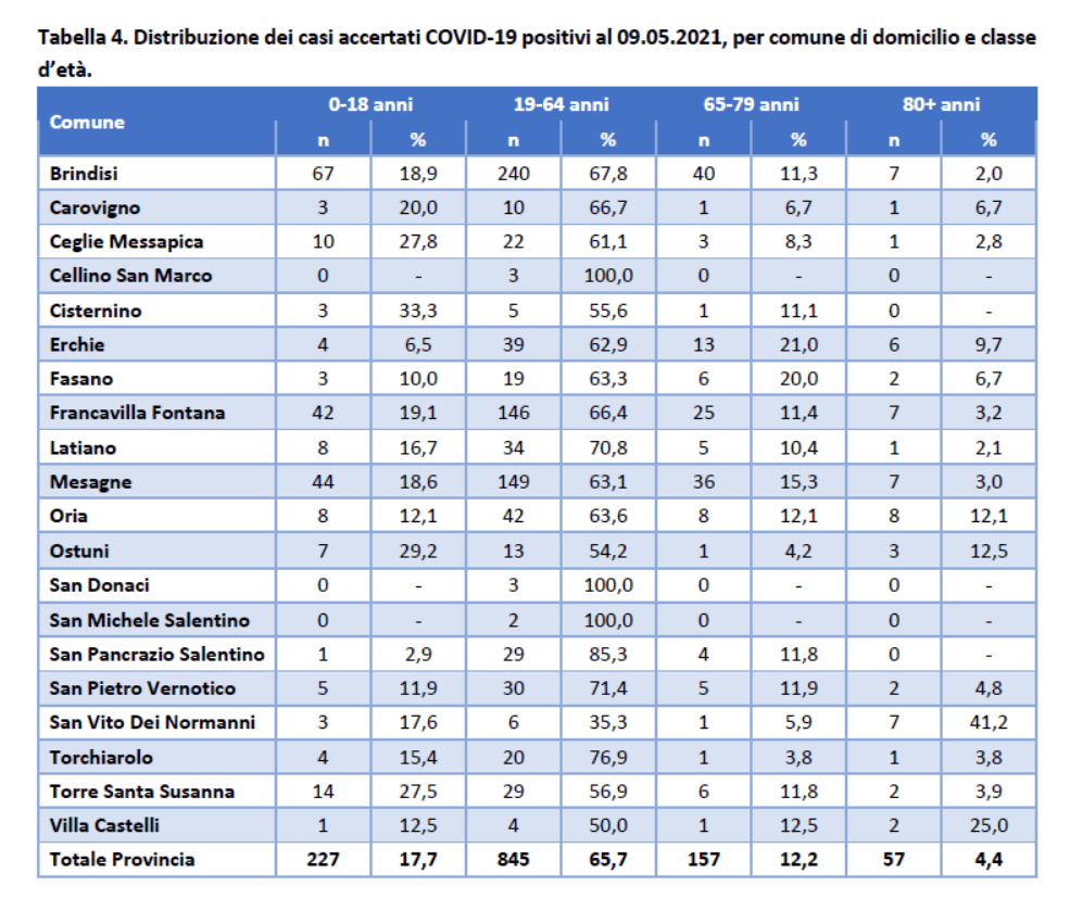 Per quanto riguarda il resto della provincia, i positivi sono 354 a Brindisi, 236 a Mesagne, 220 a Francavilla Fontana, 66 a Oria, 62 a Erchie, 51 a Torre Santa Susanna, 48 a Latiano, 42 a San Pietro Vernotico, 36 a Ceglie Messapica, 34 a San Pancrazio Salentino, 30 a Fasano, 26 a Torchiarolo, 24 a Ostuni, 17 a San Vito dei Normanni, 15 a Carovigno, 9 a Cisternino, 8 a Villa Castelli, 3 a Cellino San Marco, 3 a San Donaci, 2 a San Michele Salentino. I Comuni della provincia di Brindisi con i maggiori valori di incidenza cumulativa sono, nell’ordine, Torre Santa Susanna, Brindisi, Oria, Ceglie Messapica, Francavilla Fontana, Villa Castelli.