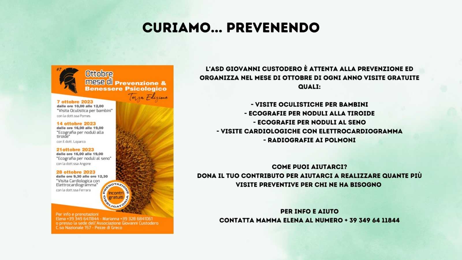 Per info e prenotazioni contattare Elena Maggi (349 6411844) o Mariana (328 6841061), o recarsi presso la sede dell’Associazione Giovanni Custodero in C.so Nazionale 157 a Pezze di Greco.