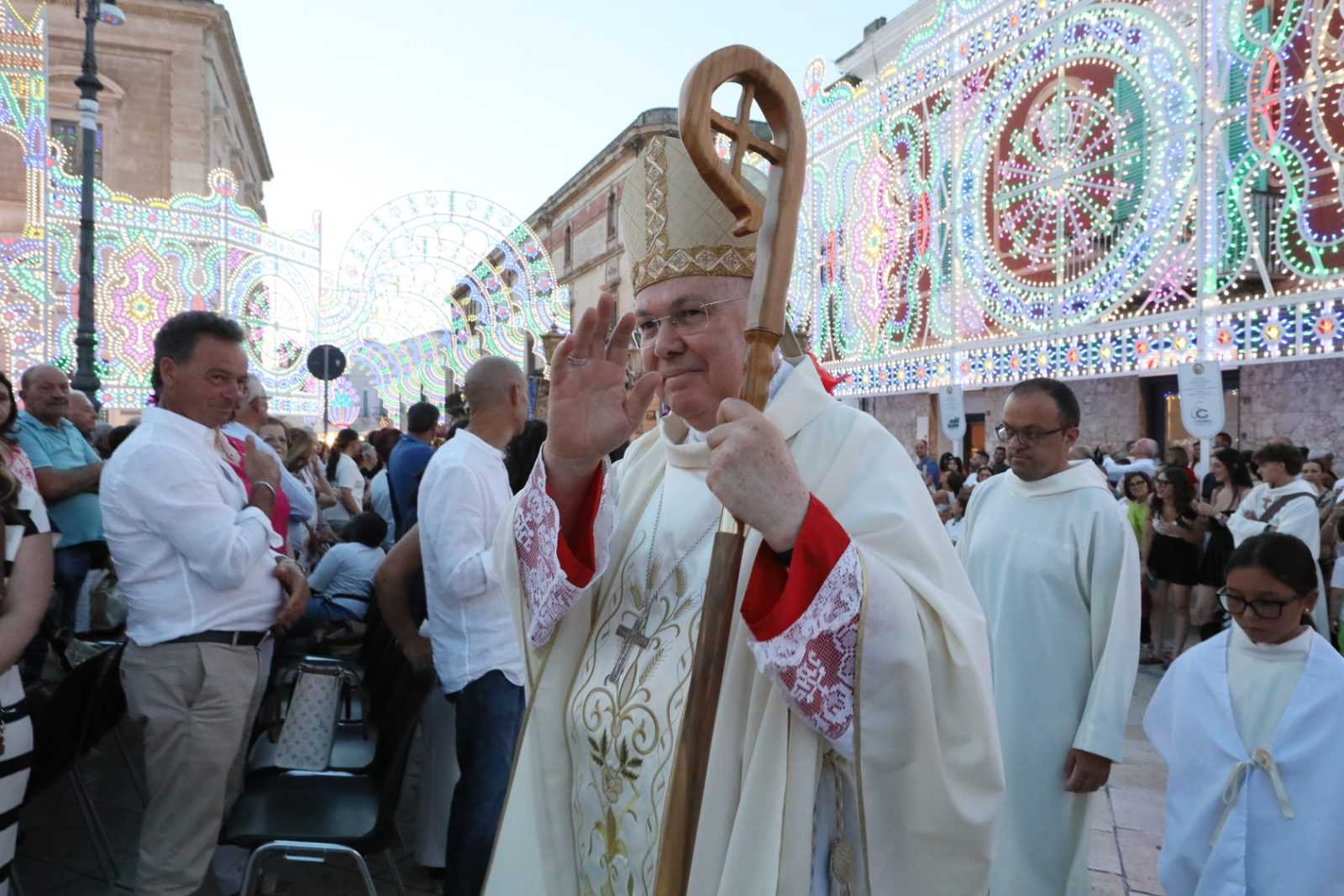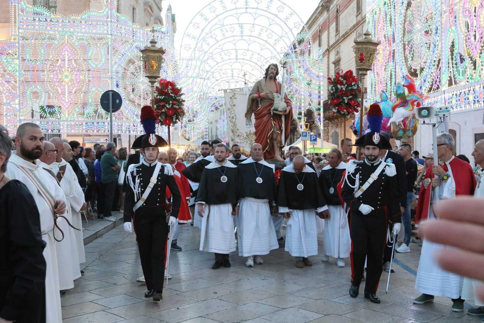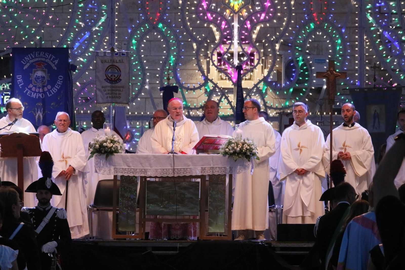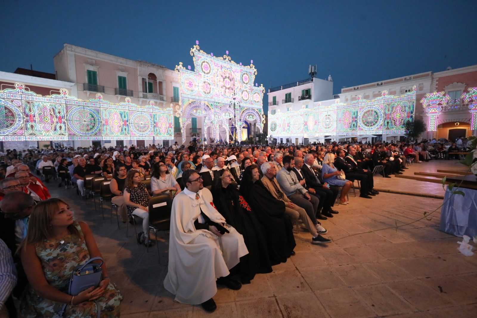 Il percorso della processione, seguito con grande partecipazione dai fedeli, è culminato in Piazza Ciaia, dove si è svolta la solenne concelebrazione eucaristica. La celebrazione è stata presieduta da Mons. Giuseppe Favale, Vescovo della Diocesi di Conversano Monopoli. La piazza, gremita di devoti, ha risuonato delle parole del Vescovo che, alla vigilia della festività dedicata alla nascita di San Giovanni, ha sottolineato l’importanza del santo come simbolo di rinnovamento e guida spirituale. Mons. Favale ha invitato i presenti a seguire l’esempio di San Giovanni, incoraggiandoli a percorrere una strada di rinnovamento interiore e comunitario. Le sue parole hanno risuonato con forza tra i fedeli, rafforzando il legame della comunità con i propri Santi Patroni e rinnovando lo spirito di fede che caratterizza la città di Fasano.