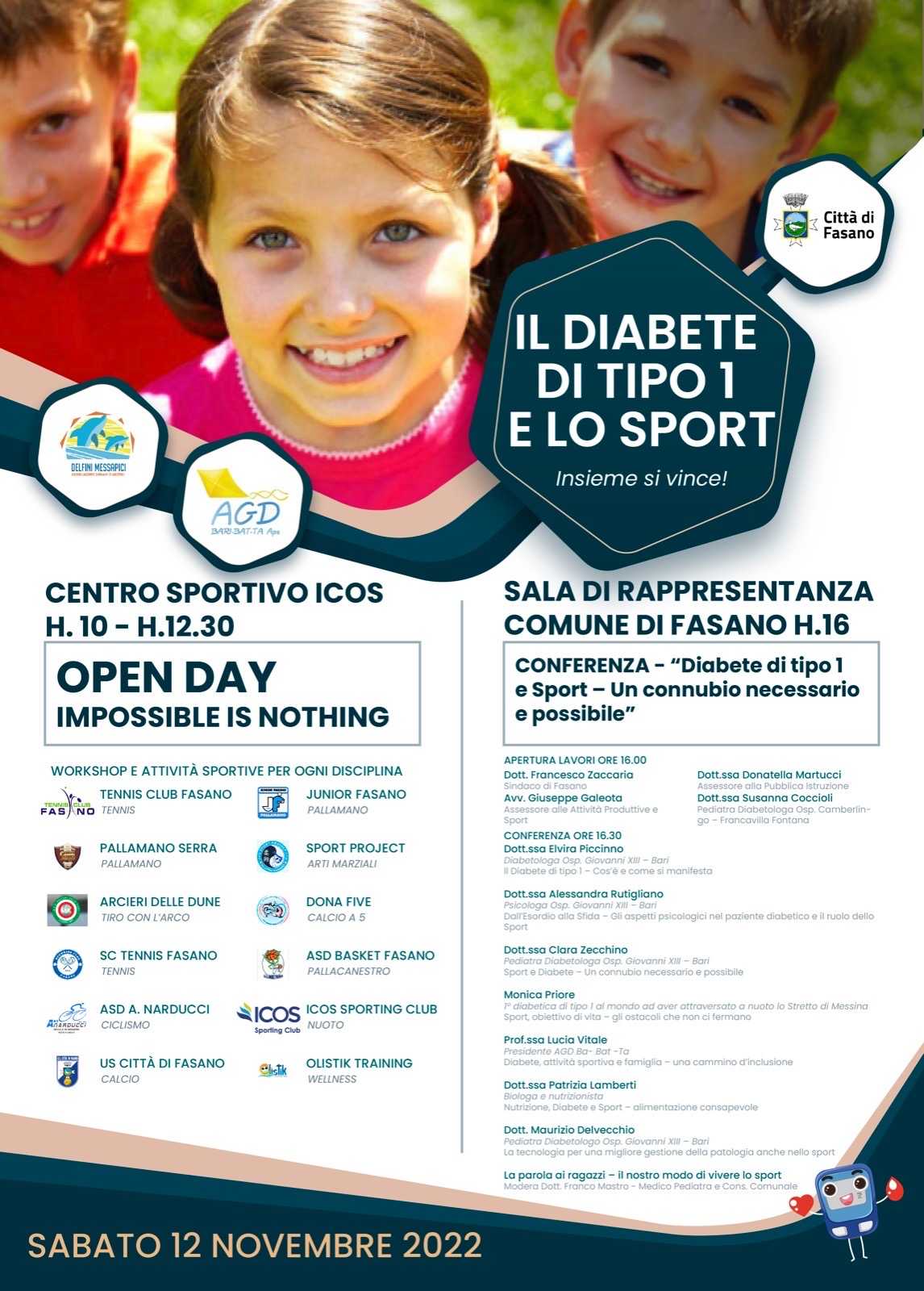 Sabato 12 novembre, in occasione della Giornata Mondiale del Diabete che si celebra ogni anno il 14 novembre, Fasano ospiterà un evento con protagonisti bambini e ragazzi, in particolare affetti da Diabete di tipo 1, e le diverse associazioni sportive locali. Realtà del territorio, istituzioni, giovani, medici ed esperti si confronteranno per una giornata di inclusione e dimostrare che “Niente è impossibile”, come recita il titolo scelto per l’open day che aprirà la giornata e che vedrà le diverse associazioni sportive accogliere bambini e ragazzi per offrire loro la possibilità di provare in sicurezza più discipline.