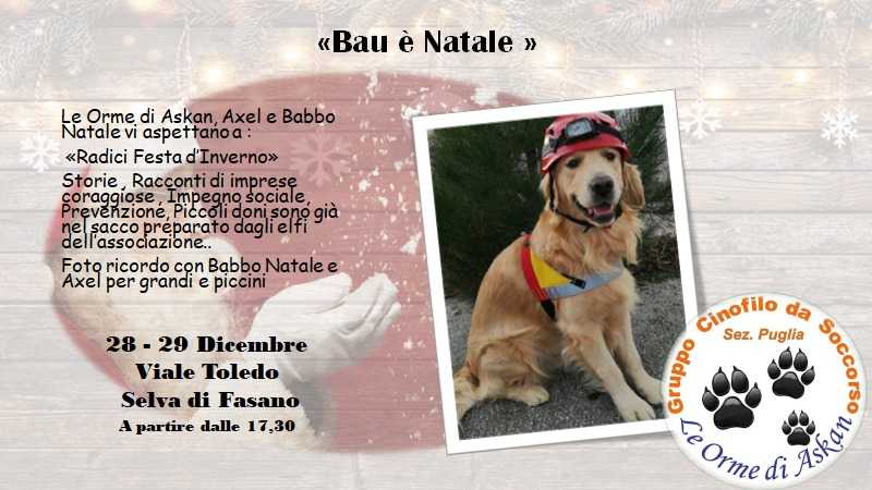 In occasione del Natale, con “Bau è Natale“, lo stand allestito espressamente per questa occasione, l’associazione sarà presente in località Selva di Fasano nell’ambito del programma di “Radici Festa d’inverno”, non solo per far conoscere le proprie attività ma per accogliere grandi e piccini con un Babbo Natale davvero speciale nei giorni del 28 e 29 dicembre a partire dalle 17.30.