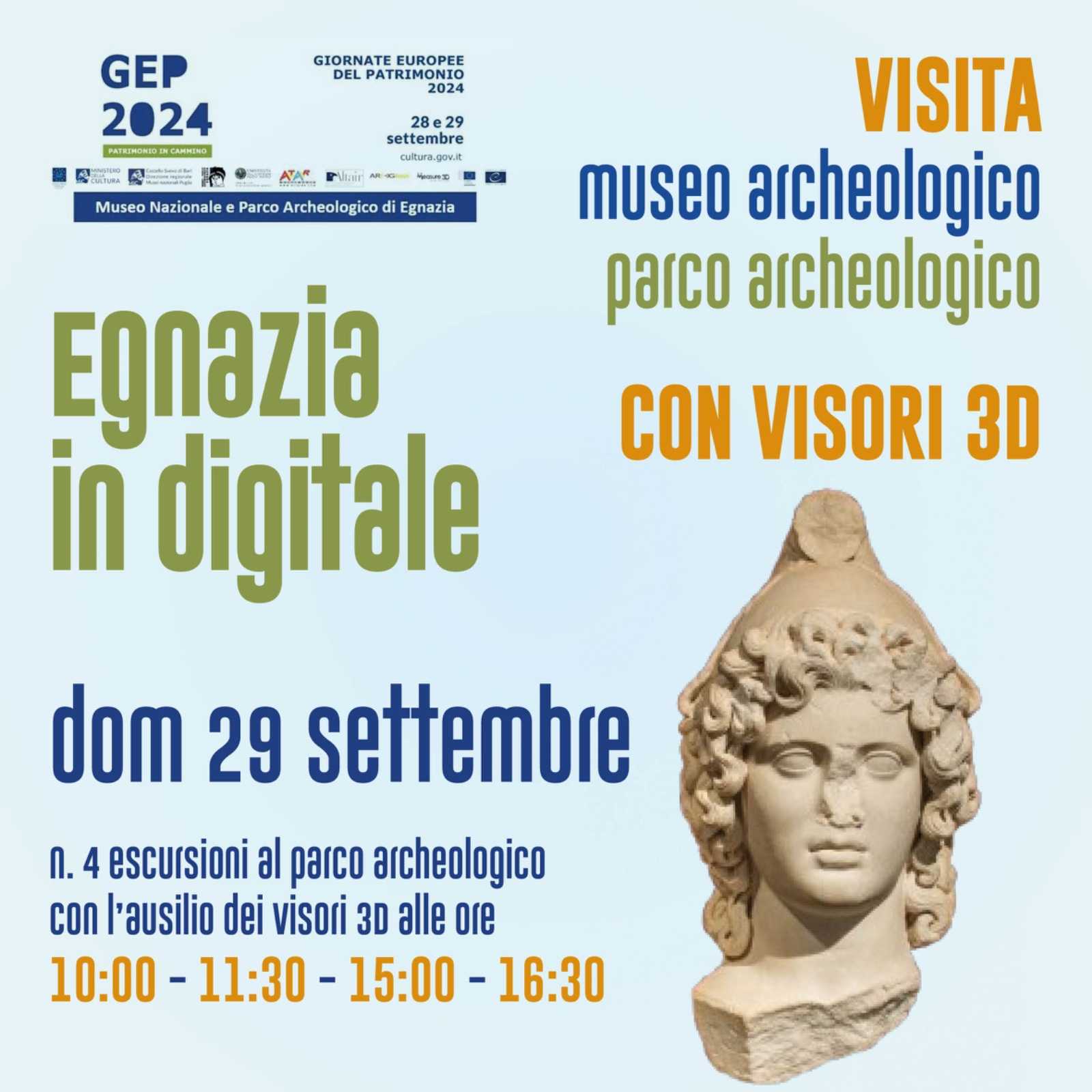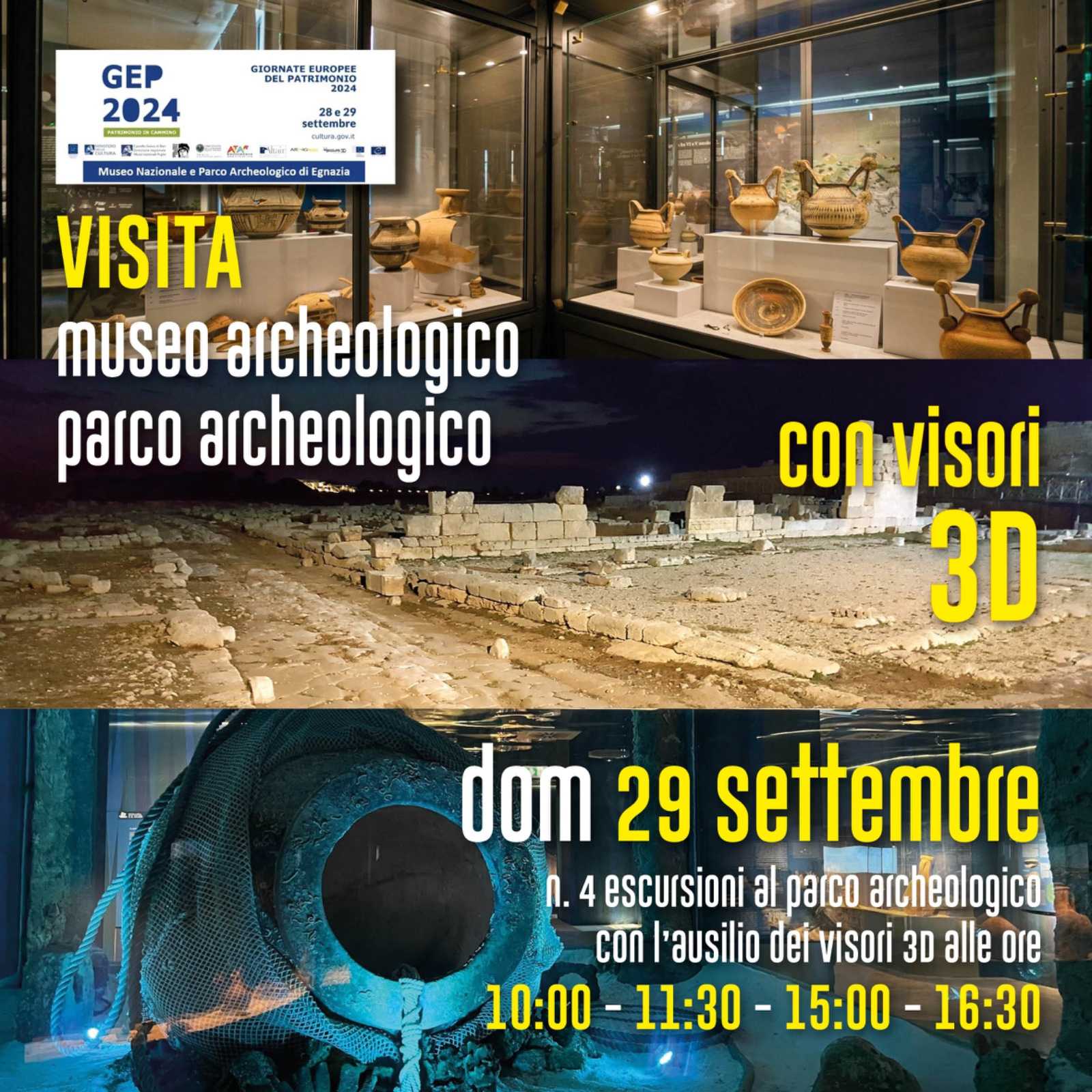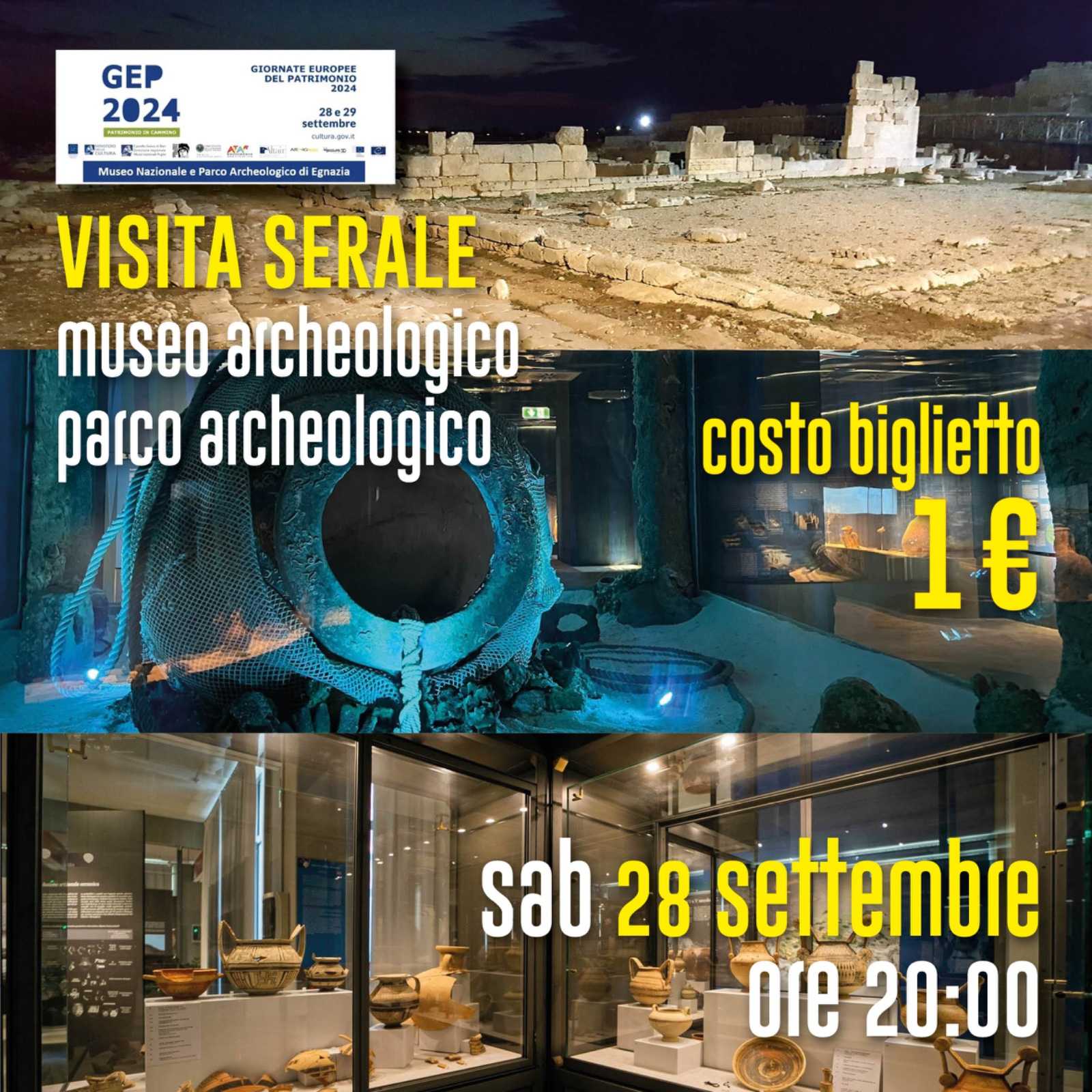 Contestualmente, nella giornata di sabato 28 ci sarà l’apertura straordinaria del Museo e Parco archeologico di Egnazia dalle 20:00 alle 22:45, con un prezzo speciale del biglietto di 1€; nella giornata di domenica 29 sarà possibile effettuare escursioni al Museo Nazionale e Parco Archeologico con l’ausilio di visori 3D e in ben 4 fasce orarie: 10.00 – 11.30 – 15.00 – 16.30.