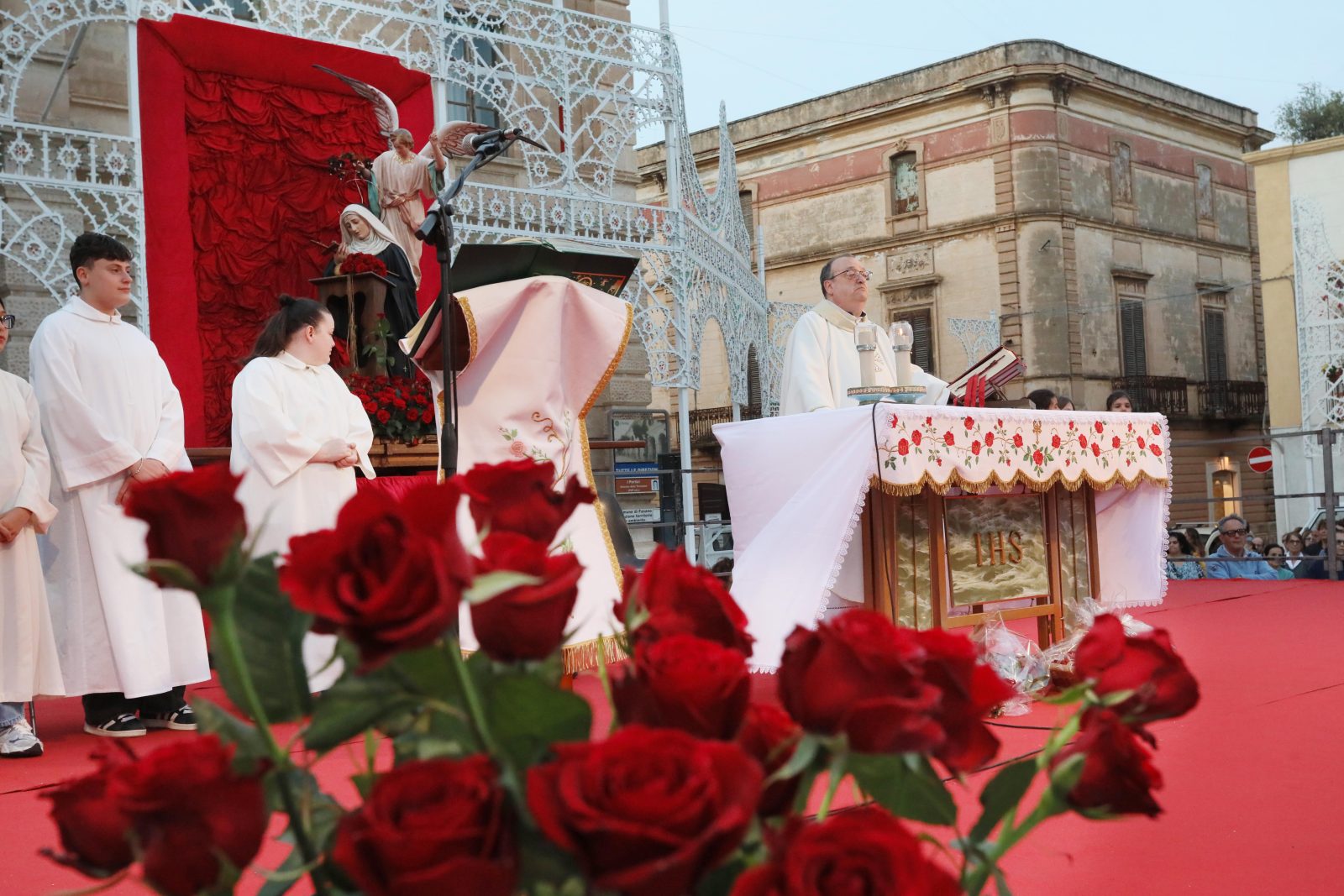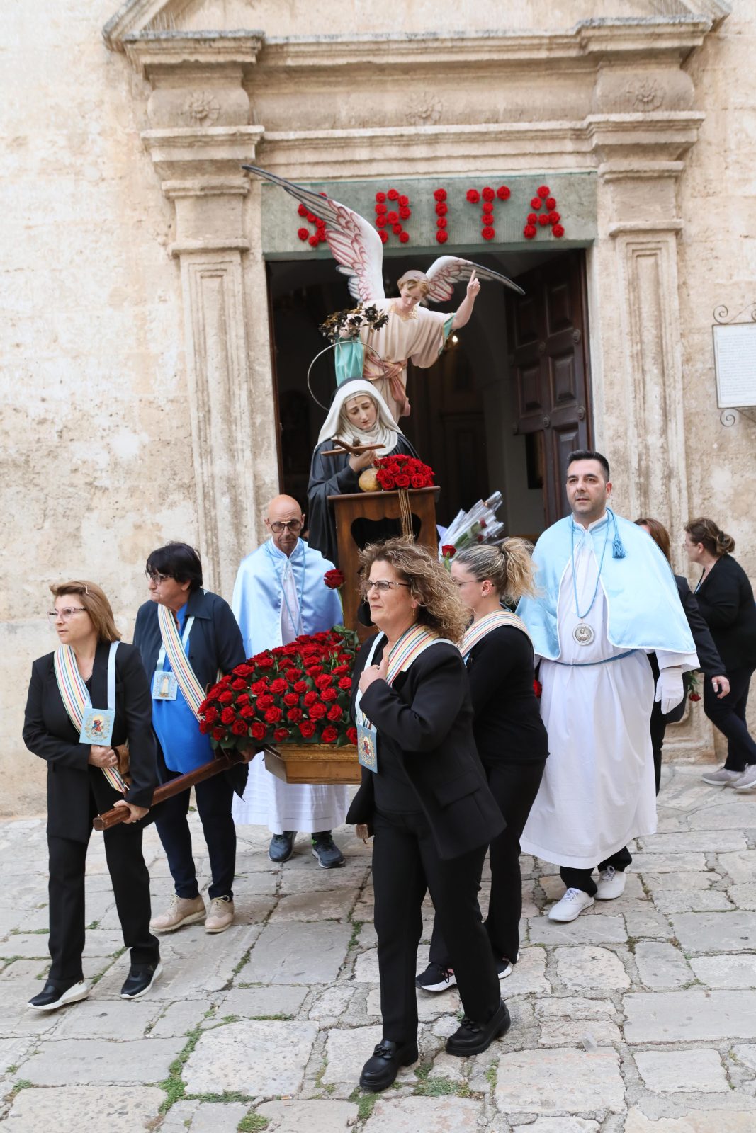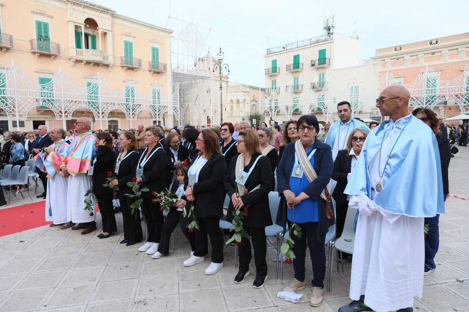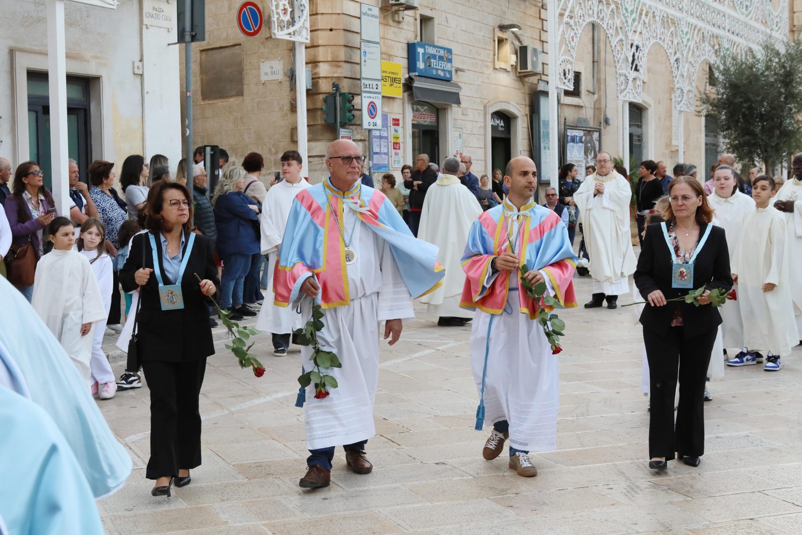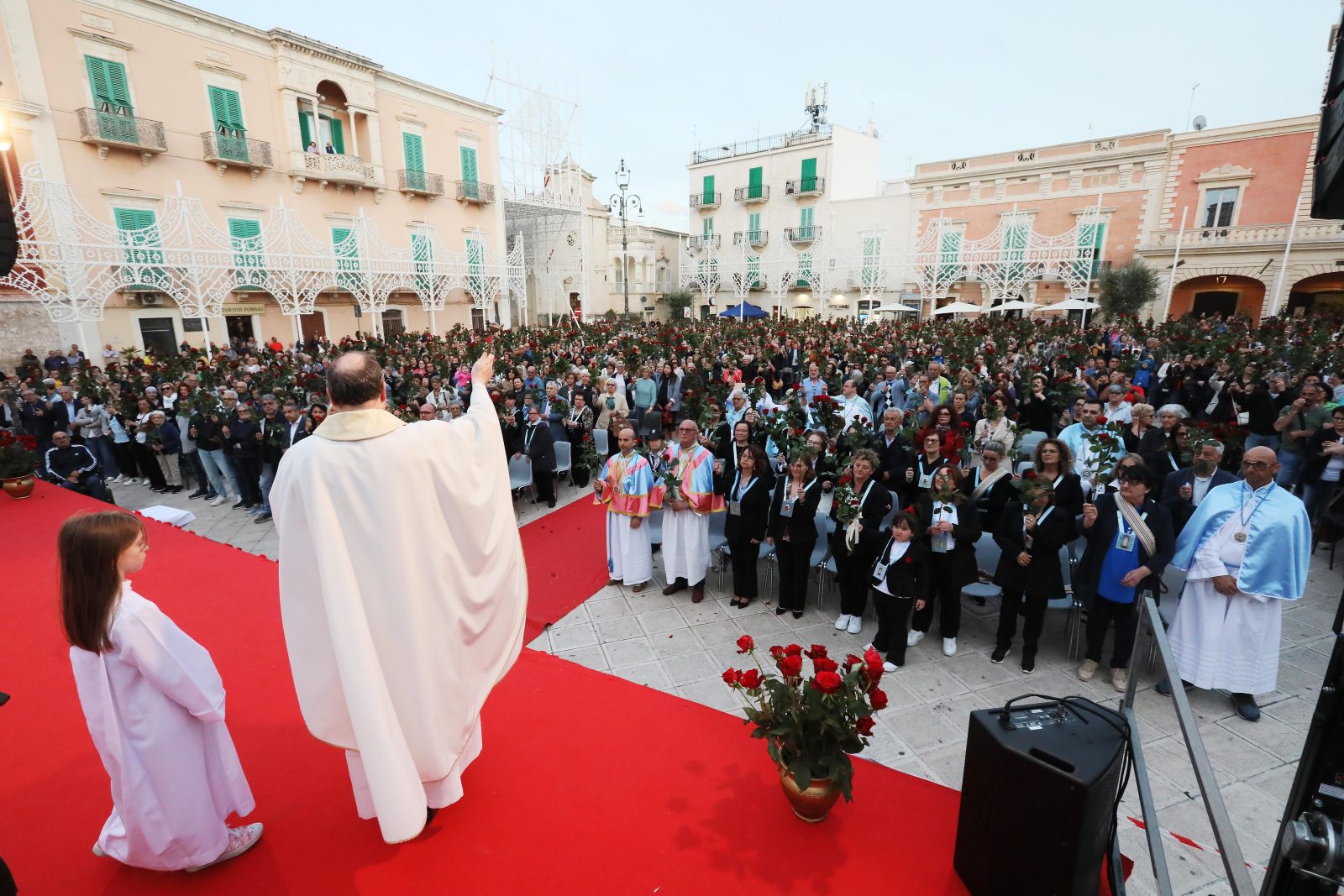 La piazza è stata splendidamente allestita con rose all’uncinetto, simbolo di Santa Rita, realizzate a mano dall’associazione fasanese “APS U’ntrattine”: un gesto d’amore e dedizione che ha dato un tocco di colore e significato all’intera celebrazione.