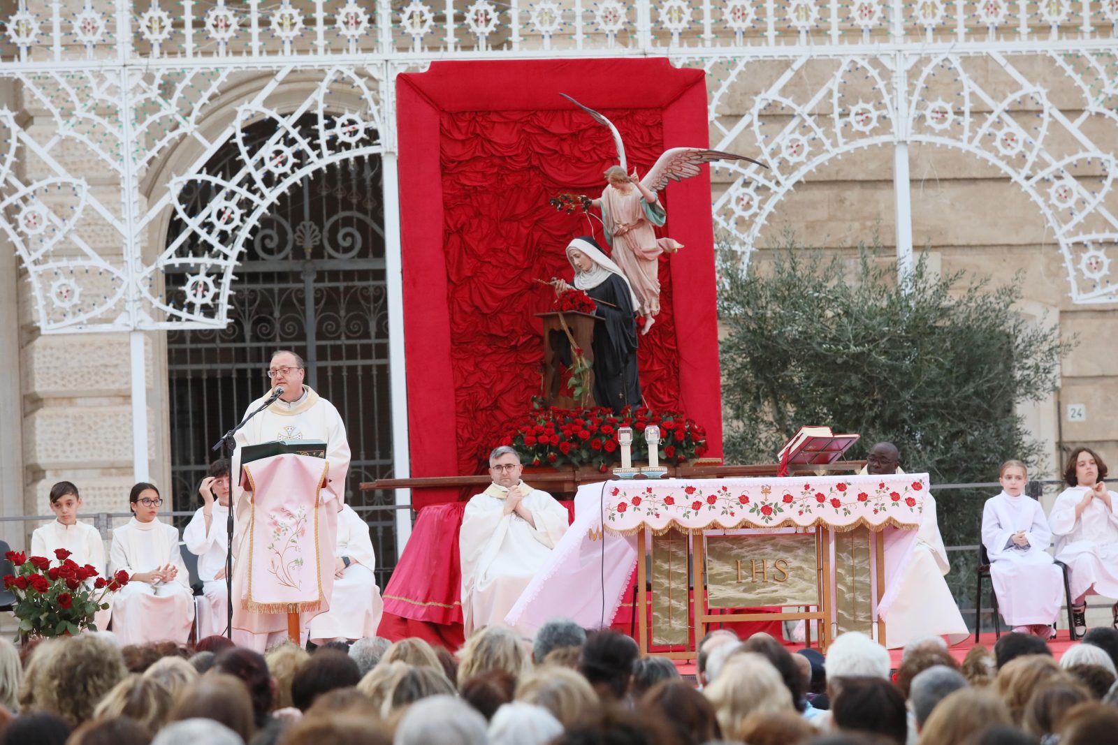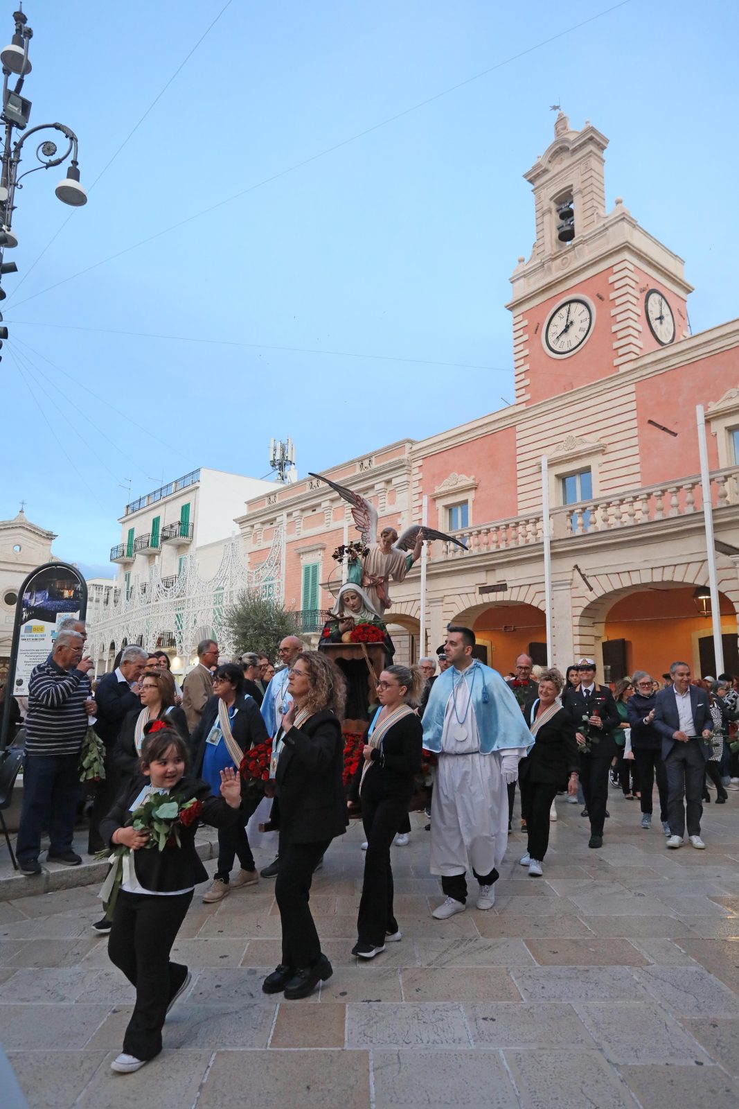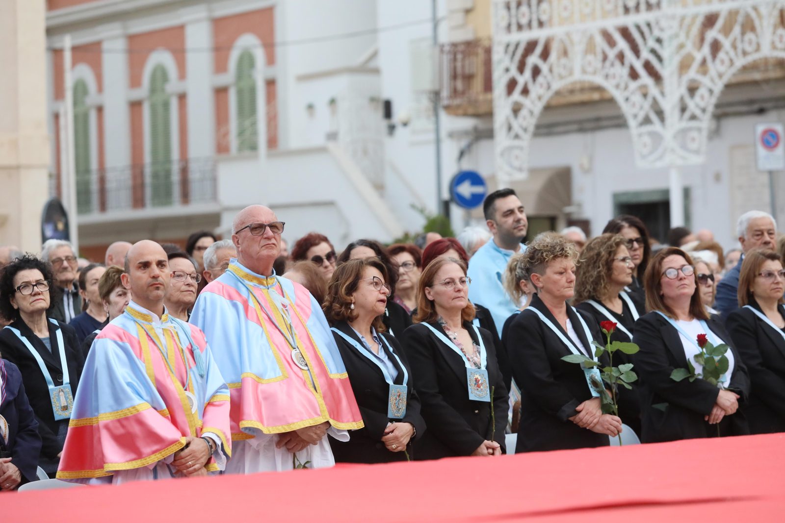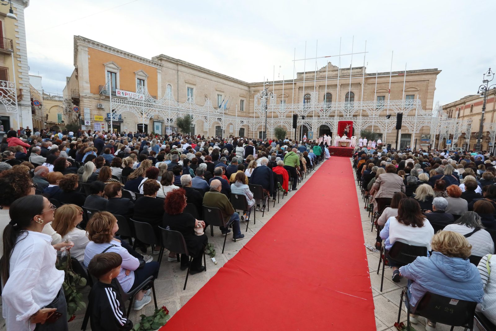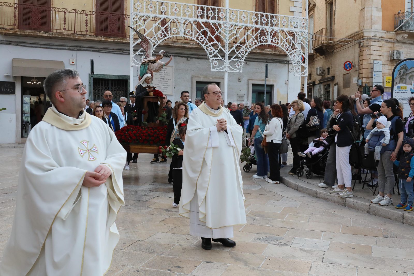 La piazza è stata splendidamente allestita con rose all’uncinetto, simbolo di Santa Rita, realizzate a mano dall’associazione fasanese “APS U’ntrattine”: un gesto d’amore e dedizione che ha dato un tocco di colore e significato all’intera celebrazione.