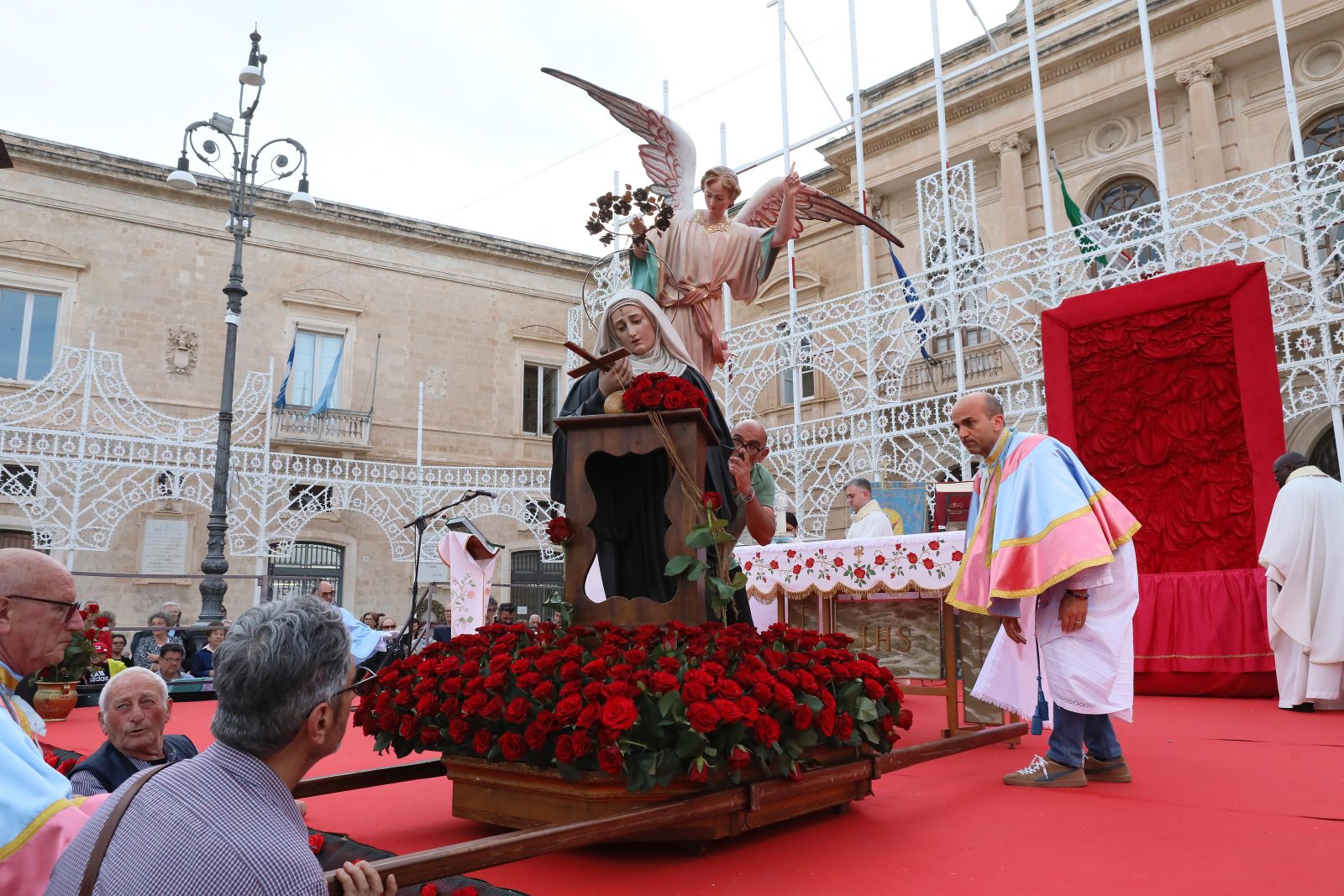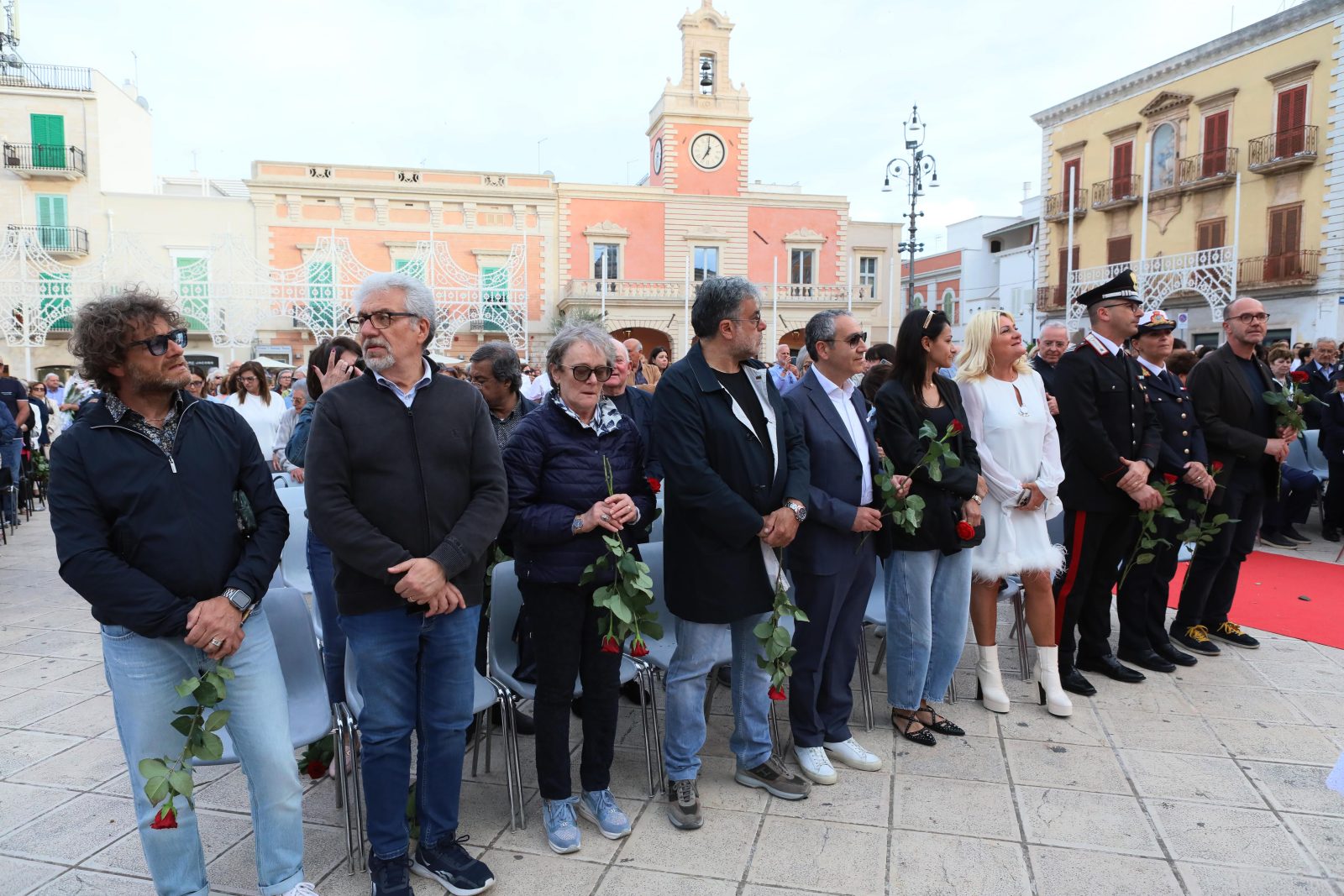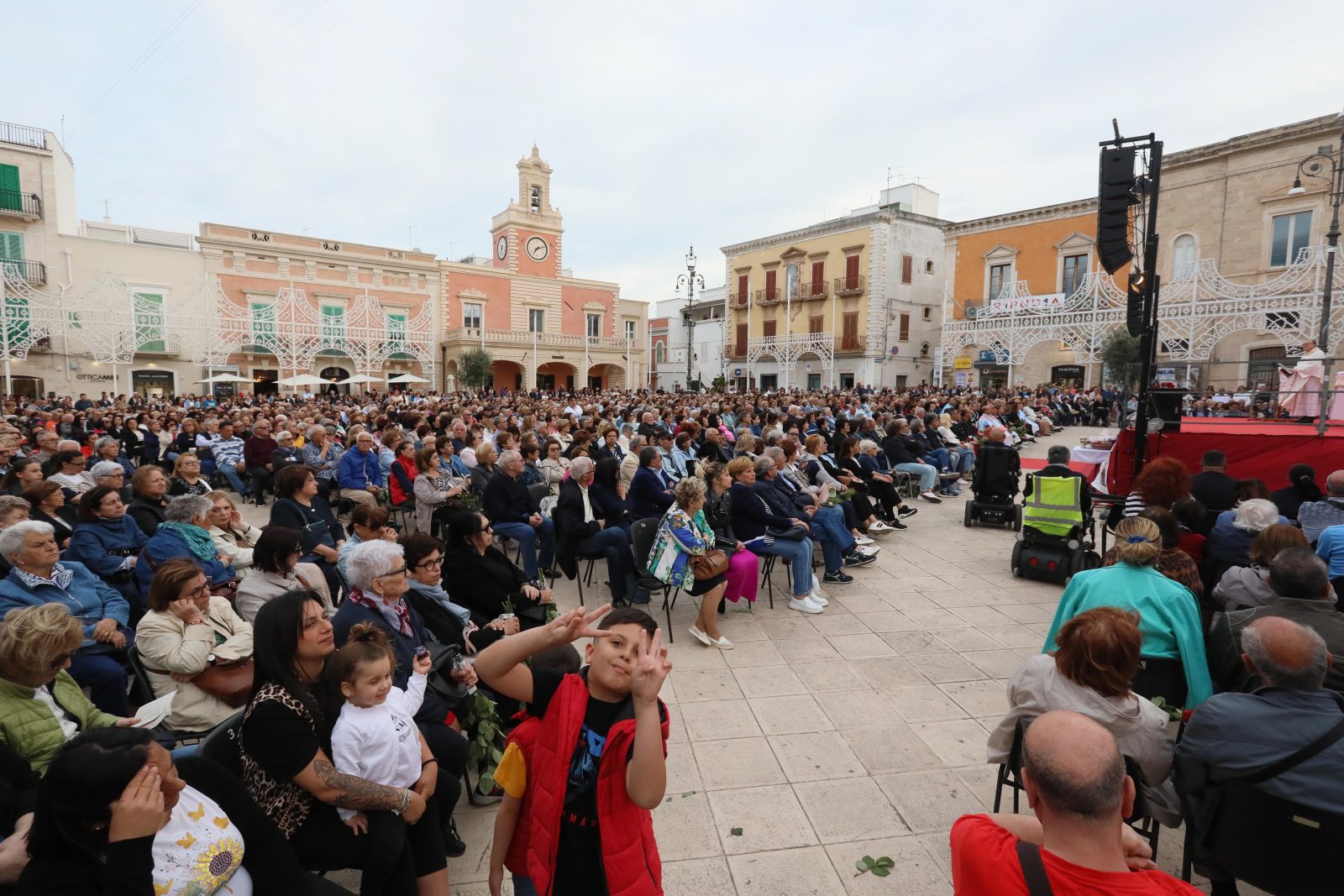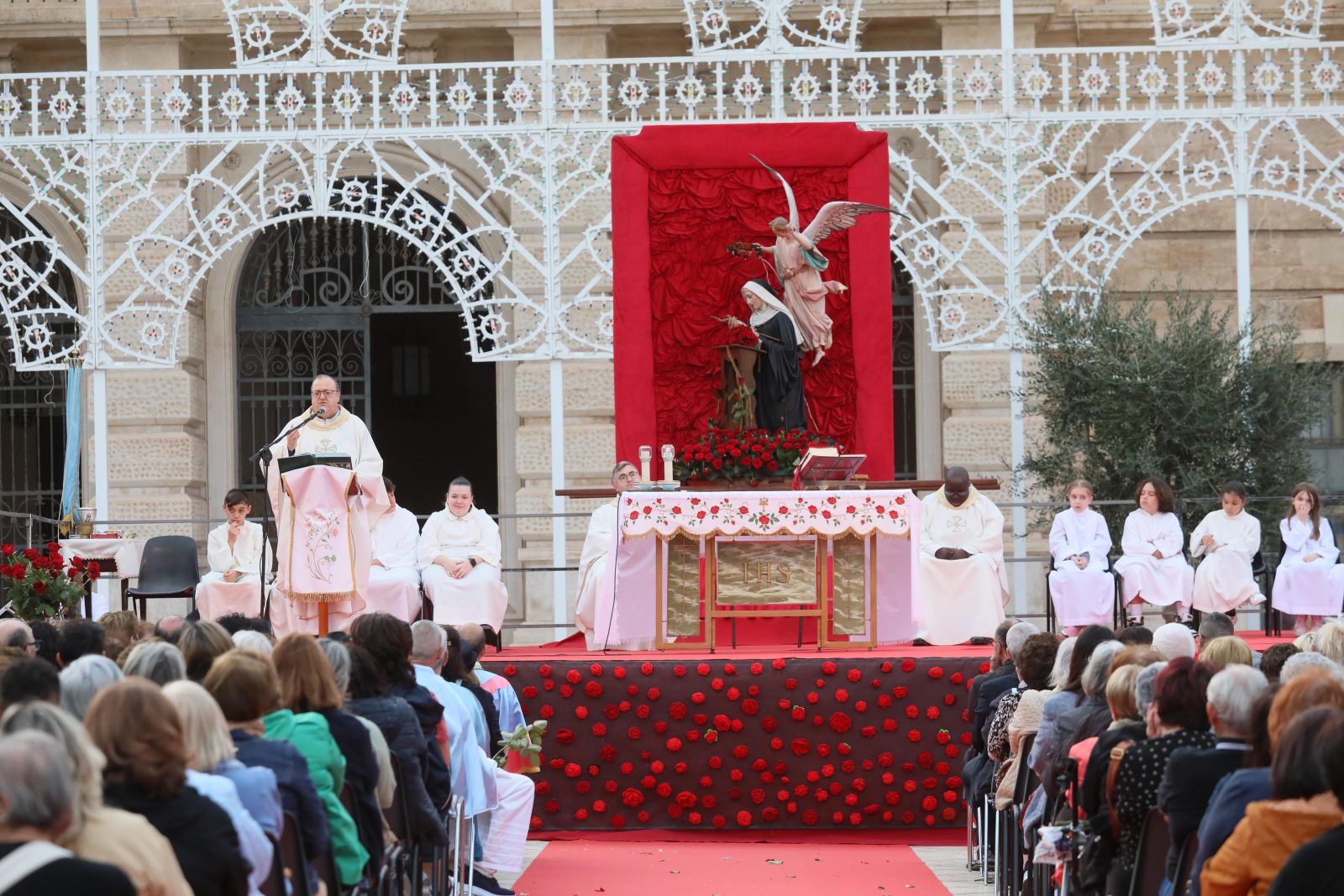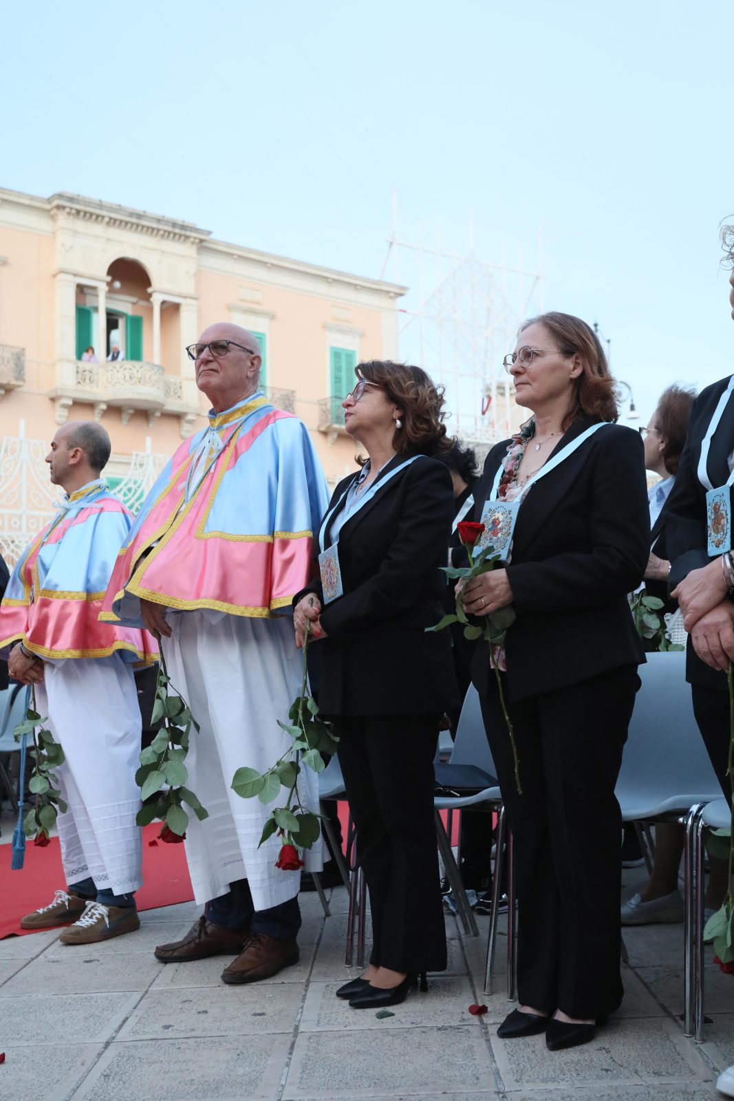 La piazza è stata splendidamente allestita con rose all’uncinetto, simbolo di Santa Rita, realizzate a mano dall’associazione fasanese “APS U’ntrattine”: un gesto d’amore e dedizione che ha dato un tocco di colore e significato all’intera celebrazione.