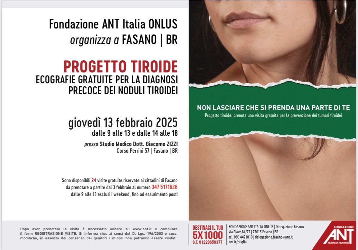 Il 13 febbraio 2025 sarà invece la volta del “Progetto Tiroide”, che offrirà ecografie gratuite per la diagnosi precoce dei noduli tiroidei. Anche questa iniziativa è riservata ai cittadini di Fasano, con particolare attenzione alla diffusione della consapevolezza sull’importanza di una diagnosi tempestiva.