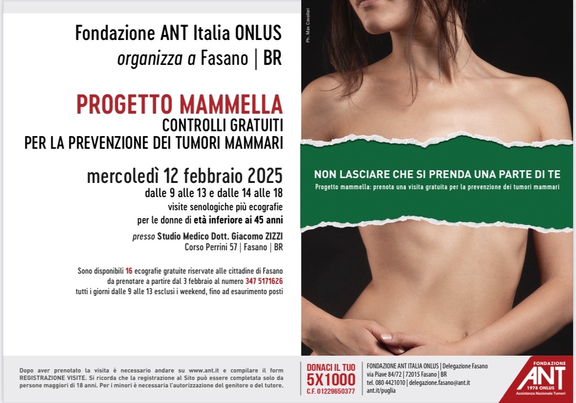 La Fondazione ANT Italia ONLUS – Sezione di Fasano ribadisce il proprio impegno per la salute e la prevenzione, continuando a proporre servizi gratuiti di qualità in tutta Italia. Per ulteriori dettagli, è possibile consultare il sito ufficiale www.ant.it/puglia