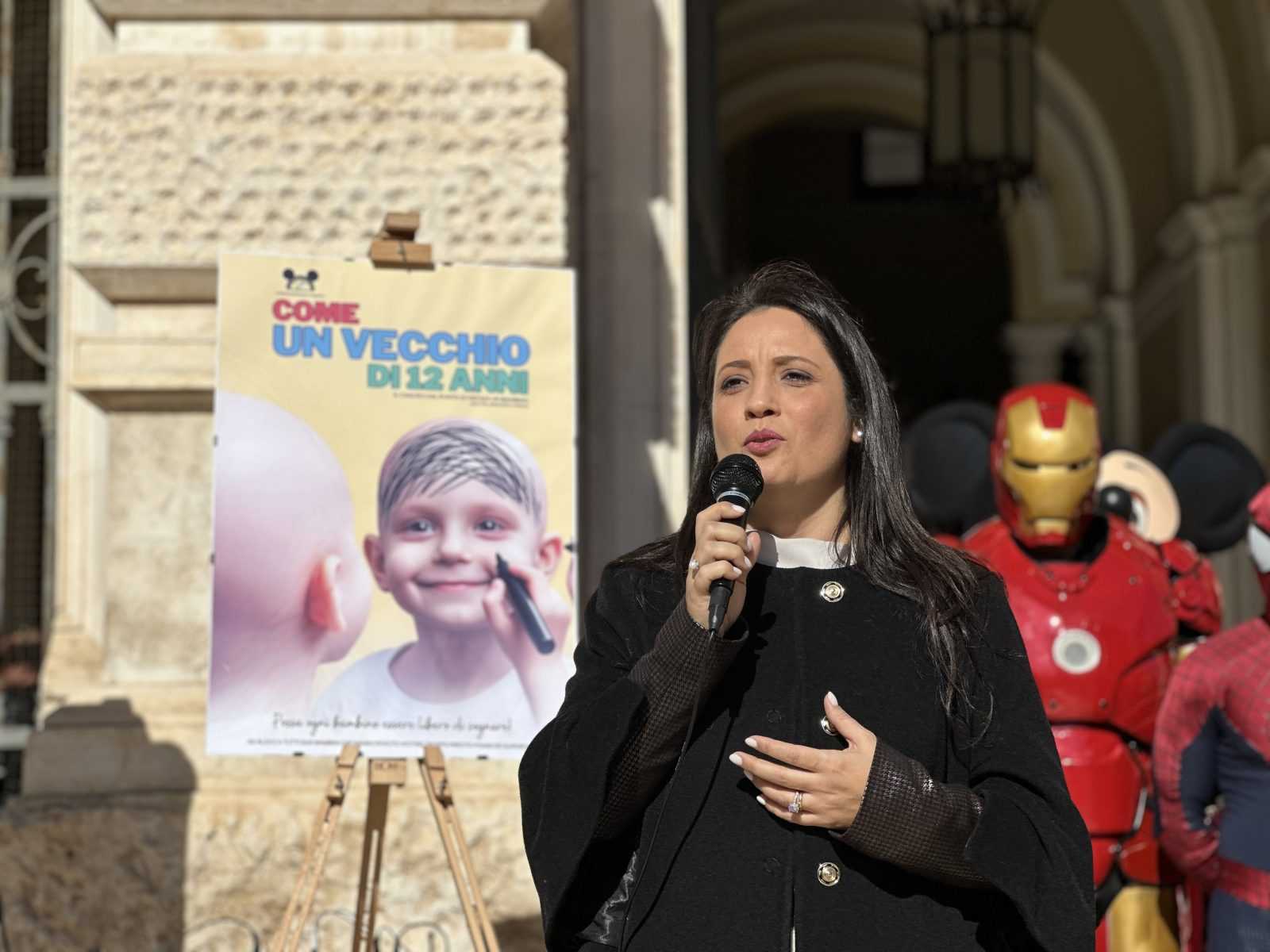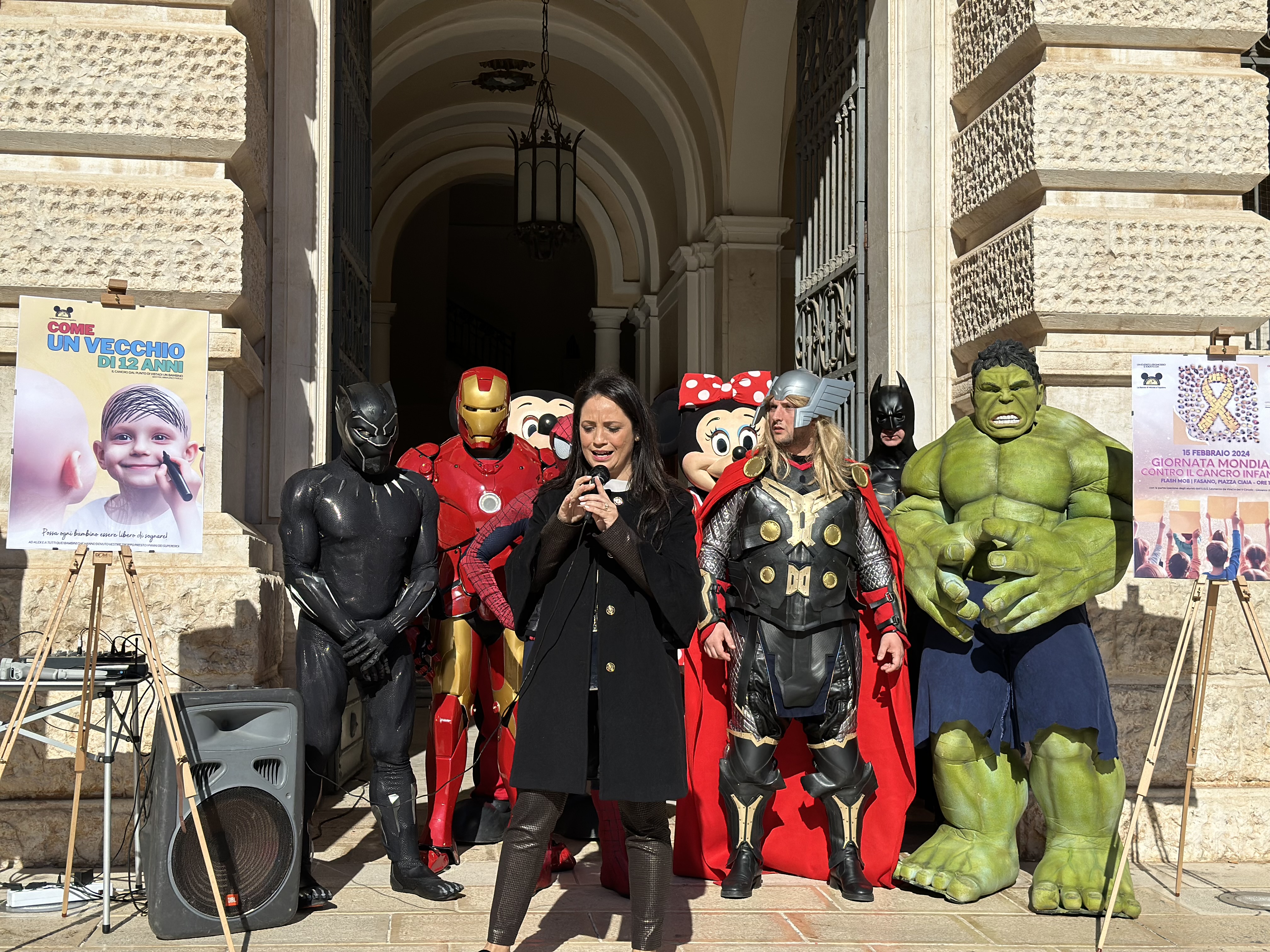 “L’idea – ha spiegato Ilaria Sardella, presidente dell’associazione ‘La Banda di Minnie e Topolino’ – era quella di utilizzare piazza Ciaia per ricreare il simbolo della lotta al cancro infantile (un fiocco giallo, ndr), sensibilizzando la popolazione e le istituzioni anche con l’inaugurazione della mostra ‘Come un vecchio di 12 anni’ che ritrae le immagini dei supereroi Marvel e dei piccoli pazienti oncologici, affiancati a frasi pronunciate dai bambini ricoverati nei reparti oncologici pediatrici”.