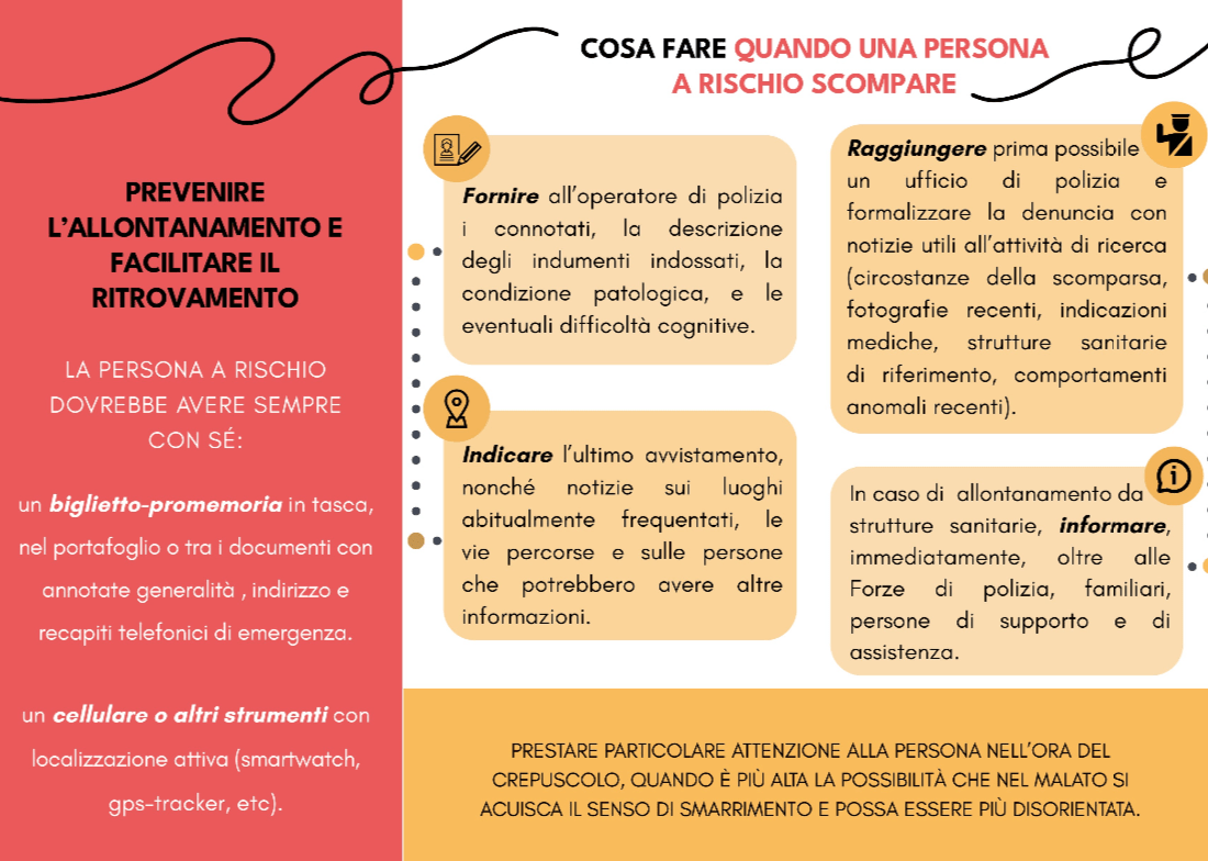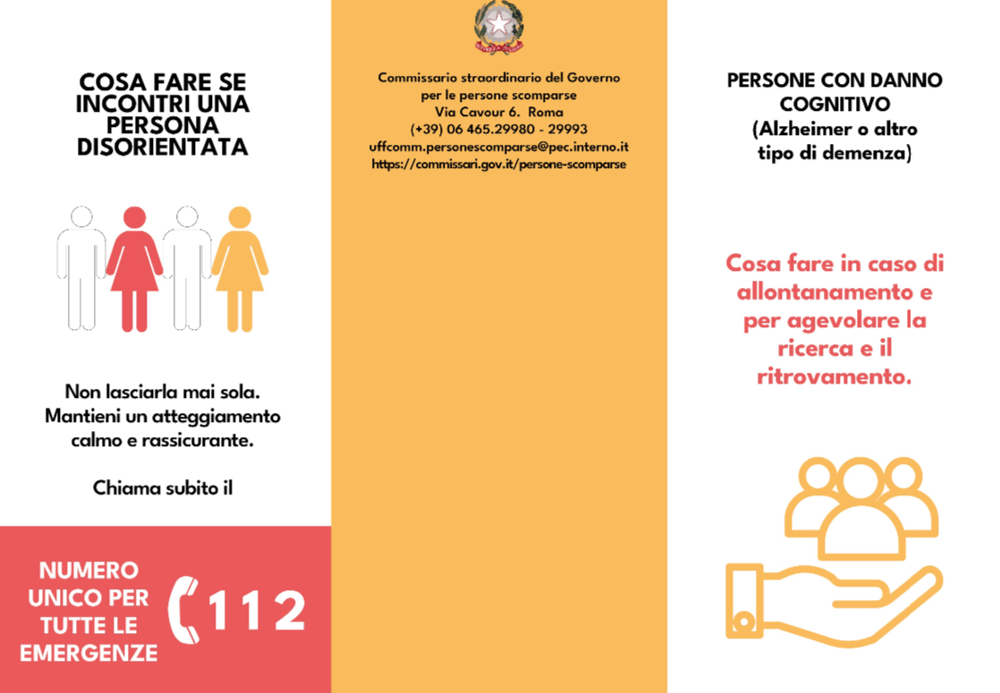 Il soprarichiamato Commissario ha altresì predisposto l’allegata brochure con la quale vengono fornite indicazioni sulle iniziative da adottare per prevenire l’allontanamento di persone con danno cognitivo e su come agevolarne la ricerca e il ritrovamento in caso di scomparsa.