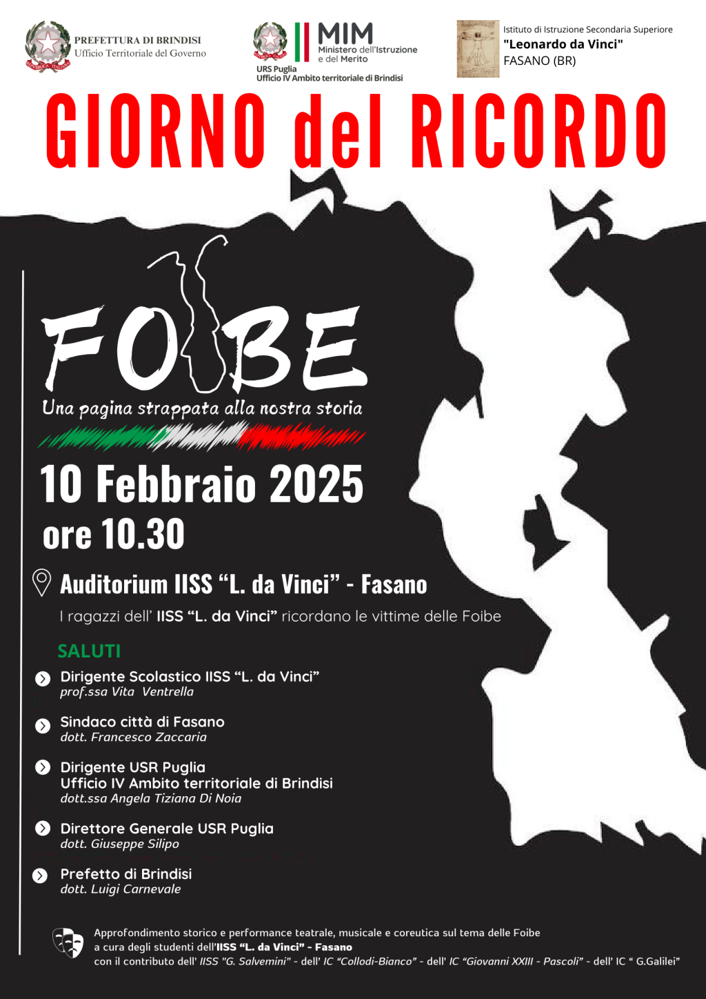 L’evento, organizzato dalla Prefettura e dall’Ufficio Scolastico Regionale per la Puglia – Ambito territoriale della provincia di Brindisi, con la collaborazione e il coinvolgimento della dirigente, dei docenti e degli studenti dell’Istituto “da Vinci”, è volto a stimolare e diffondere, soprattutto tra le nuove generazioni, la conoscenza dei tragici eventi che hanno segnato la nostra storia recente.