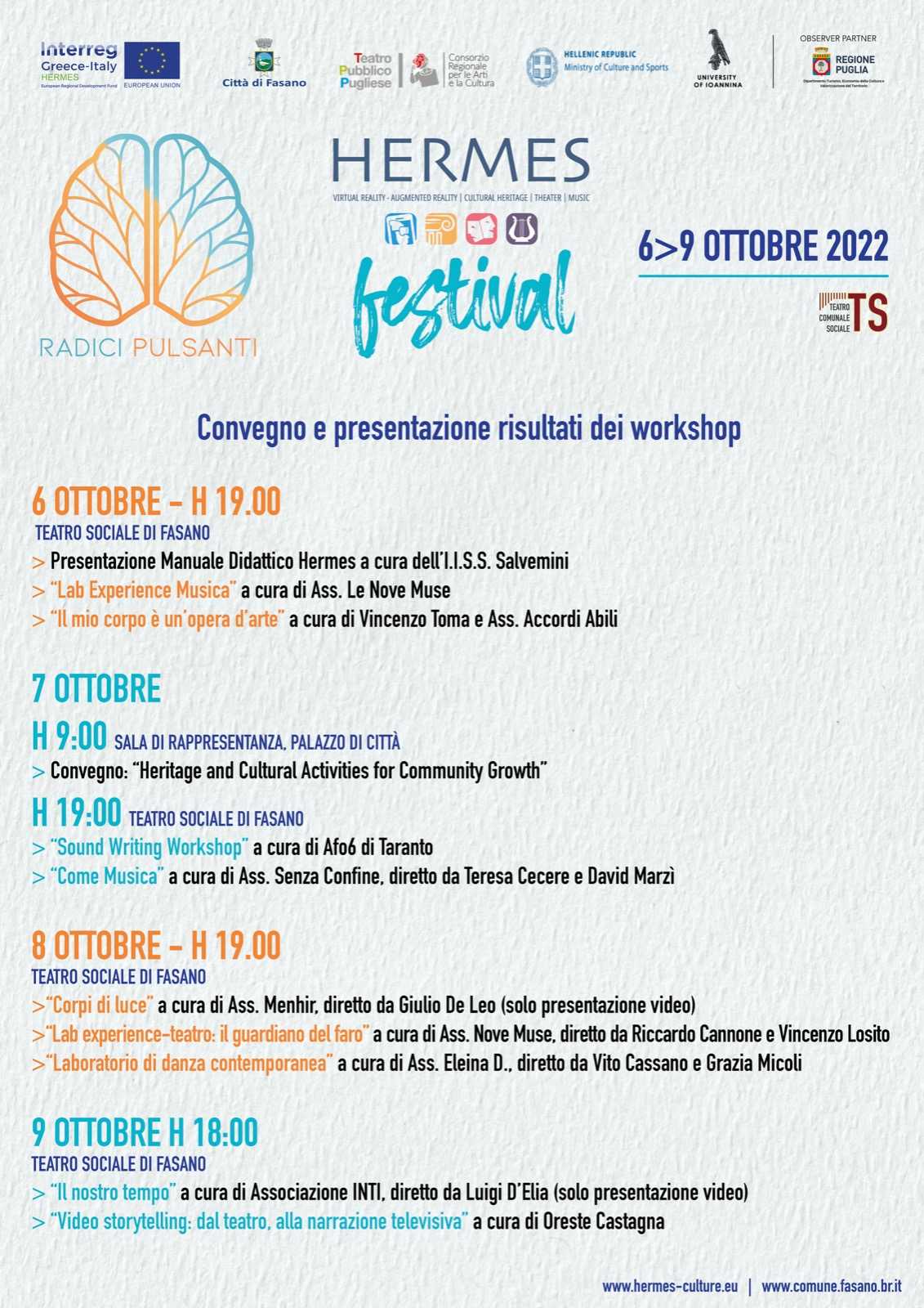 FASANO – La presentazione dei risultati dei workshop e un convegno per parlare di patrimonio e di attività culturali. È “Hermes festival-Radici Pulsanti” che animerà il fine settimana di Fasano da giovedì 6 a domenica 8 ottobre. L’evento rientra nelle attività del “Progetto Hermes – Heritage Rehabilitation as Multiplier cultural Empowerment within Social contest”, finanziato dal programma di cooperazione transfrontaliera Interreg V/A Grecia-Italia 2014-2020, che vede sempre più protagonista la città di Fasano e il Teatro Pubblico Pugliese.