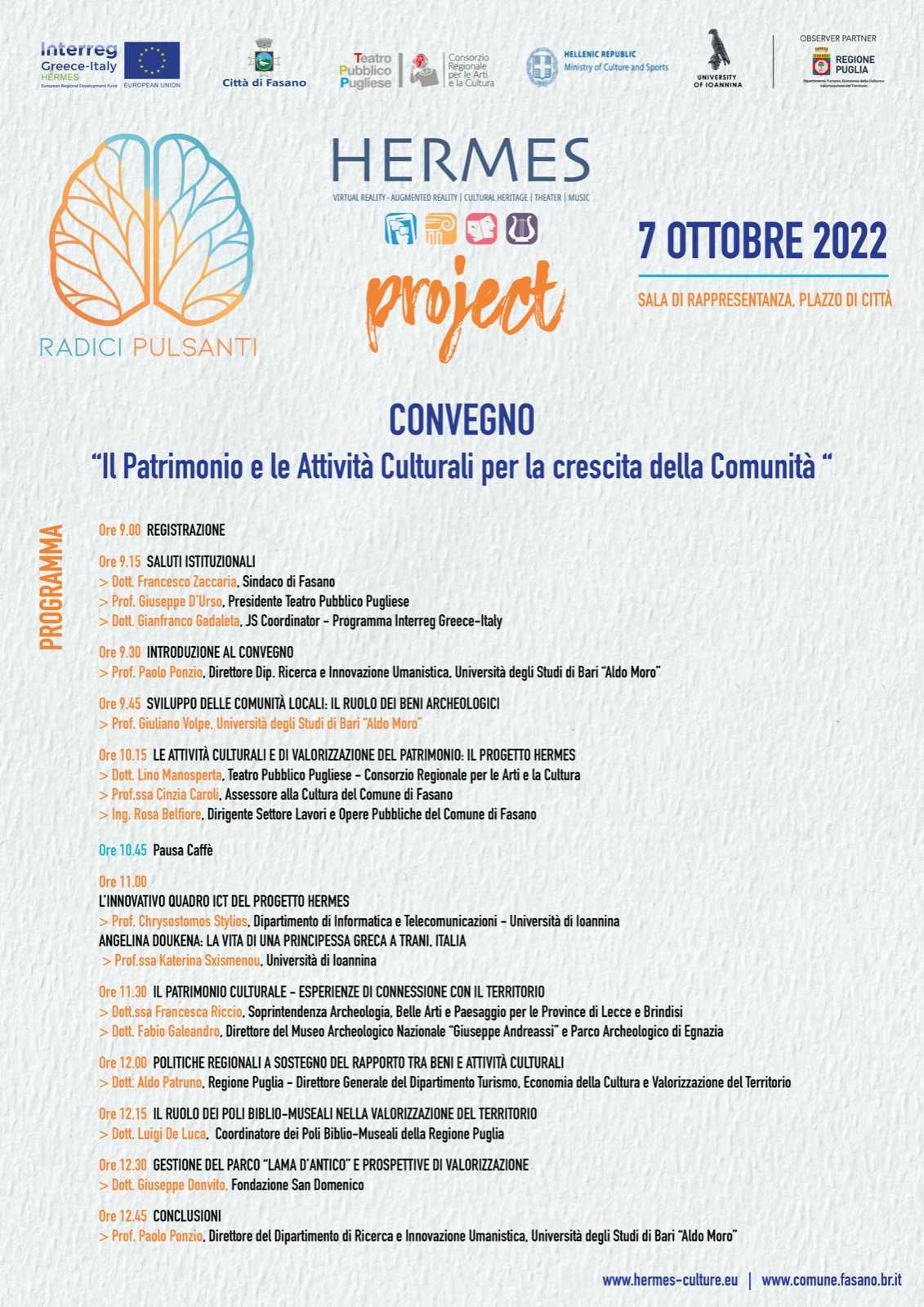 Alle 9.30 il prof. Paolo Ponzio, direttore del dipartimento di ricerca e innovazione Umanistica dell’Università di Bari, introdurrà al convegno che partirà con l’intervento del prof Giuliano Volpe (Università di Bari) sul tema “Sviluppo delle comunità locali. Il ruolo dei beni archeologici”. Si proseguirà alle 10.15 con “Le attività culturali e di valorizzazione del patrimonio: il progetto Hermes” con gli interventi di Lino Manosperta per il Teatro Pubblico Pugliese, Cinzia Caroli, assessore alla Cultura del Comune di Fasano; Rosa Belfiore, dirigente settore Lavori e Opere pubbliche del Comune di Fasano.