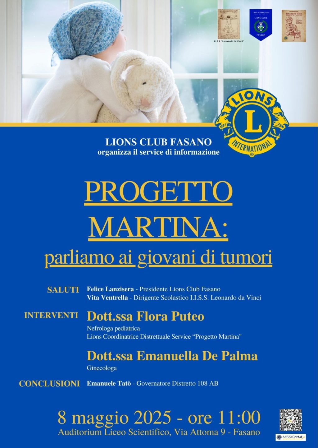 Il “Progetto Martina” (www.progettomartina.it) è promosso dai Lions italiani in ricordo della giovane Martina che, colpita da un tumore alla mammella, sollecitò l’impegno ad educare i giovani ad avere maggior cura della propria salute. Nato oltre 15 anni fa con l’intento di formare e informare gli studenti tra i 16-18 anni degli I.I.S.S. italiani, e i loro genitori, sulla cultura della prevenzione dei tumori attraverso la conoscenza dei fattori di rischio, del proprio corpo e l’educazione all’autoesame, il “Progetto Martina” ha conseguito risultati lusinghieri incidendo sul miglioramento degli stili di vita dei più giovani.