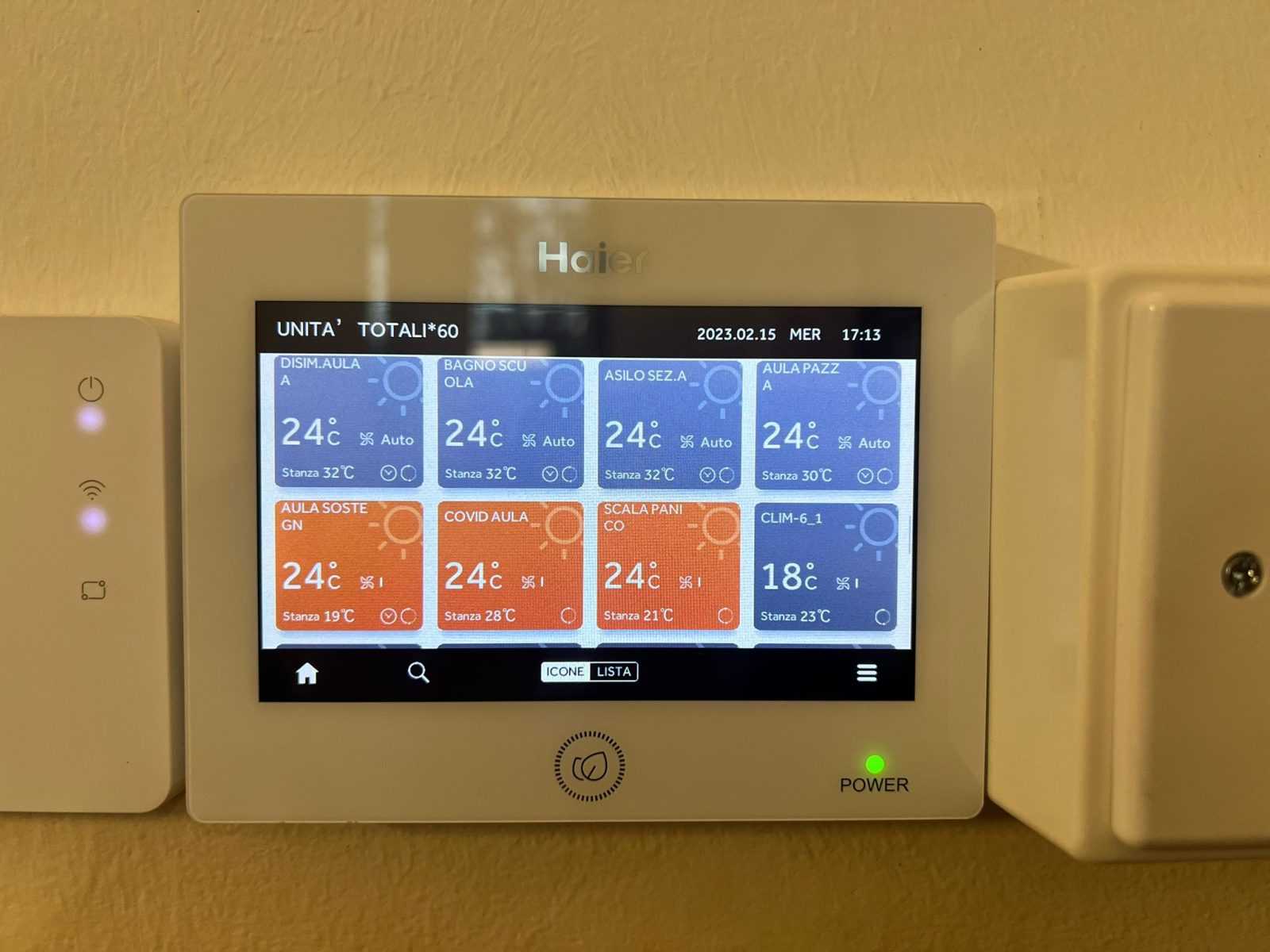 Ben 64 sono i termoconvettori posizionati all’interno di aule, corridoi e uffici, tutti controllati e “pilotati” attraverso un piccolo schermo touchscreen e tramite apposita app installata sul telefonino, che permettono di regolare la temperatura di ogni apparecchio e, eventualmente, di spegnere e accendere solamente quelli delle stanze in uso.
