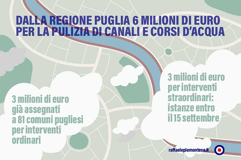 Per gli interventi straordinari di manutenzione e pulizia degli alvei dei corsi d’acqua e dei canali, la Regione ha messo a bando ulteriori 2 milioni e 977.500 euro per accedere ai quali i Comuni possono presentare istanza alla Sezione Opere Pubbliche e Infrastrutture della Regione Puglia entro il prossimo 15 settembre.