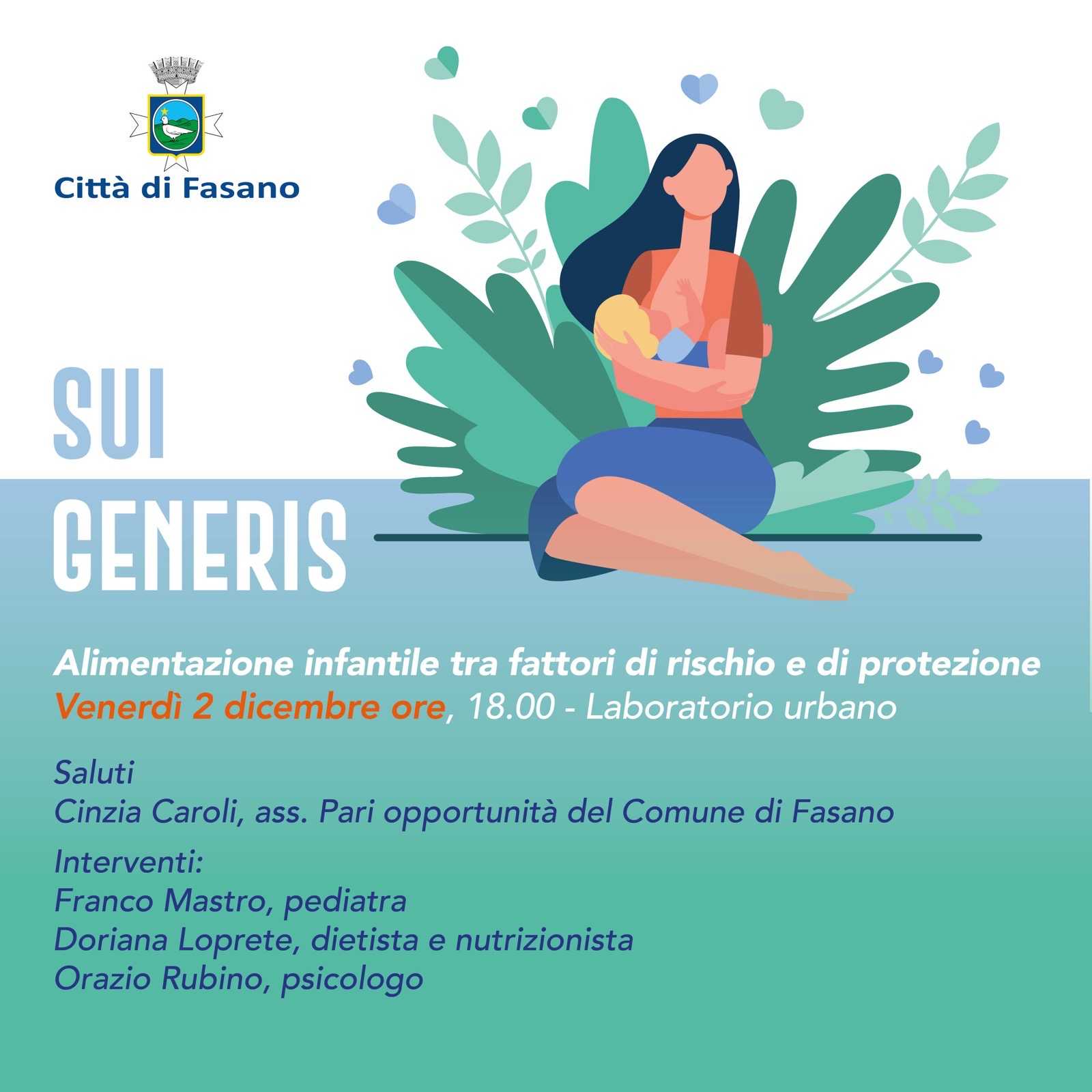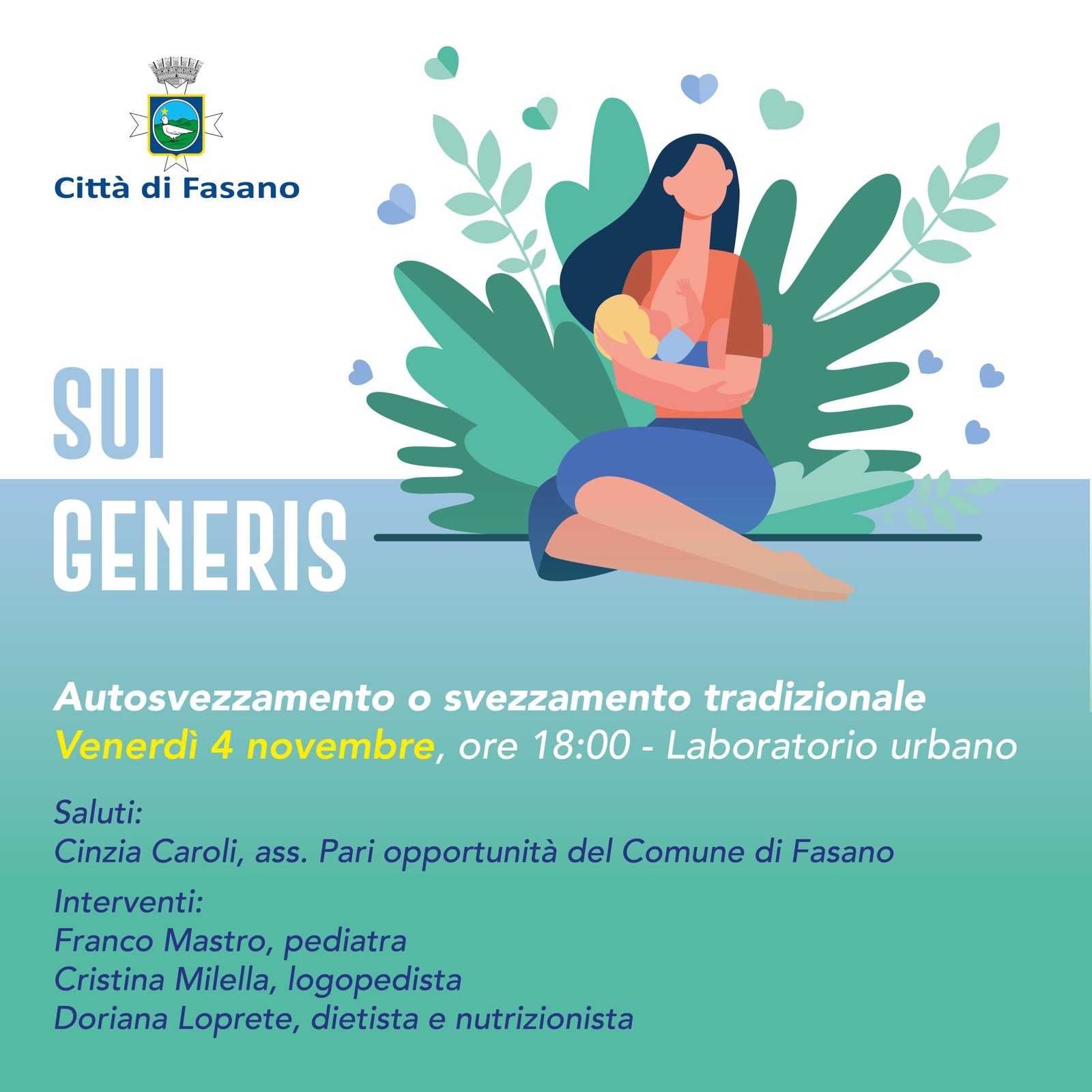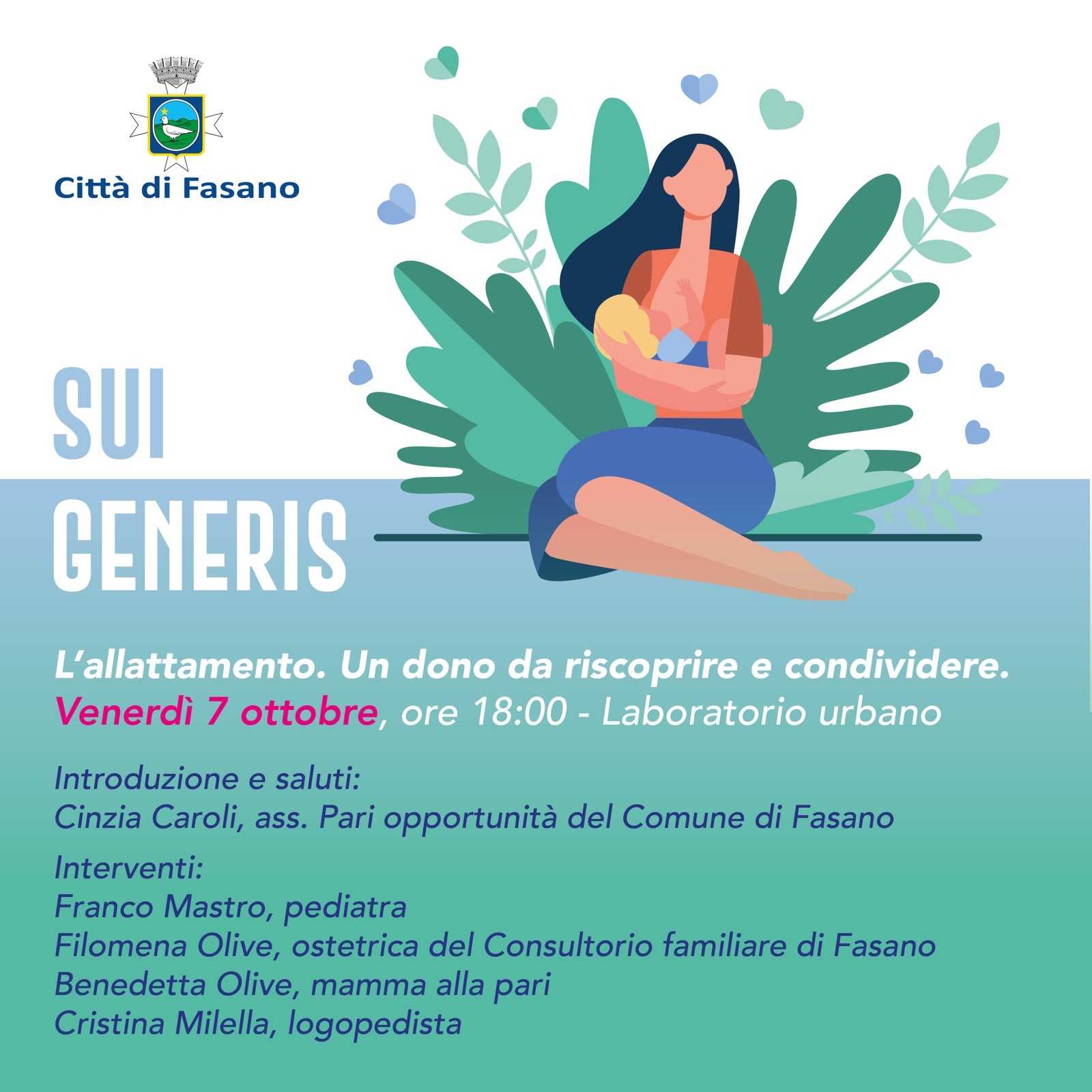– venerdì 7 ottobre presso il CiaiaLab – Laboratorio Urbano alle 18.00 il primo incontro dal titolo «L’allattamento. Un dono da riscoprire e condividere. Interverranno l’assessore alle Pari Opportunità Cinzia Caroli, il pediatra Franco Mastro, l’ostetrica del Consultorio familiare di Fasano Filomena Olive, la “mamma alla pari” Benedetta Olive e la logopedista Cristina Milella.