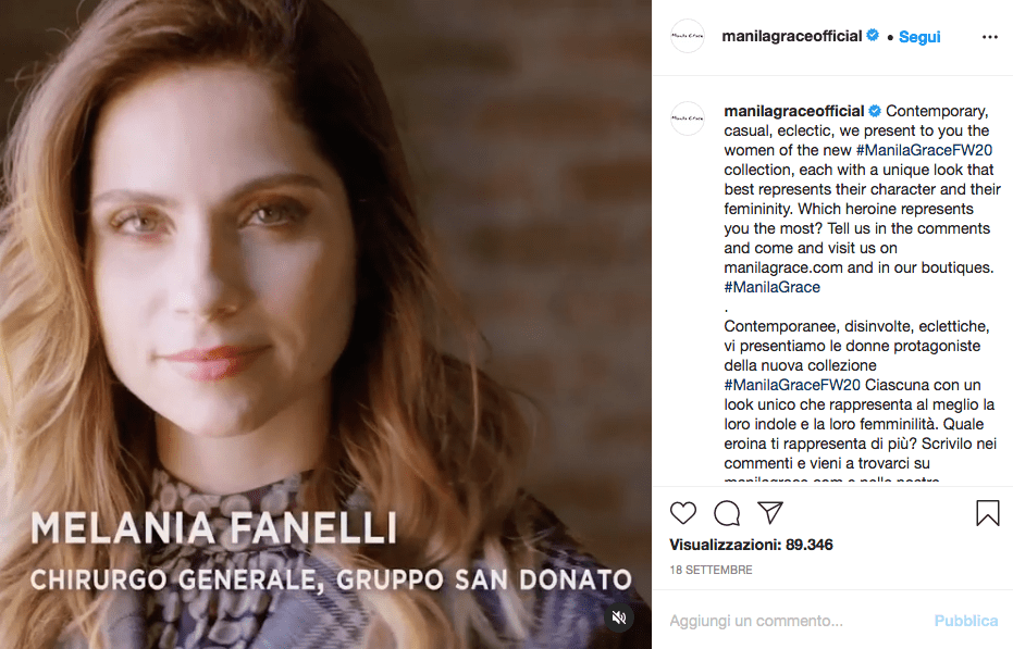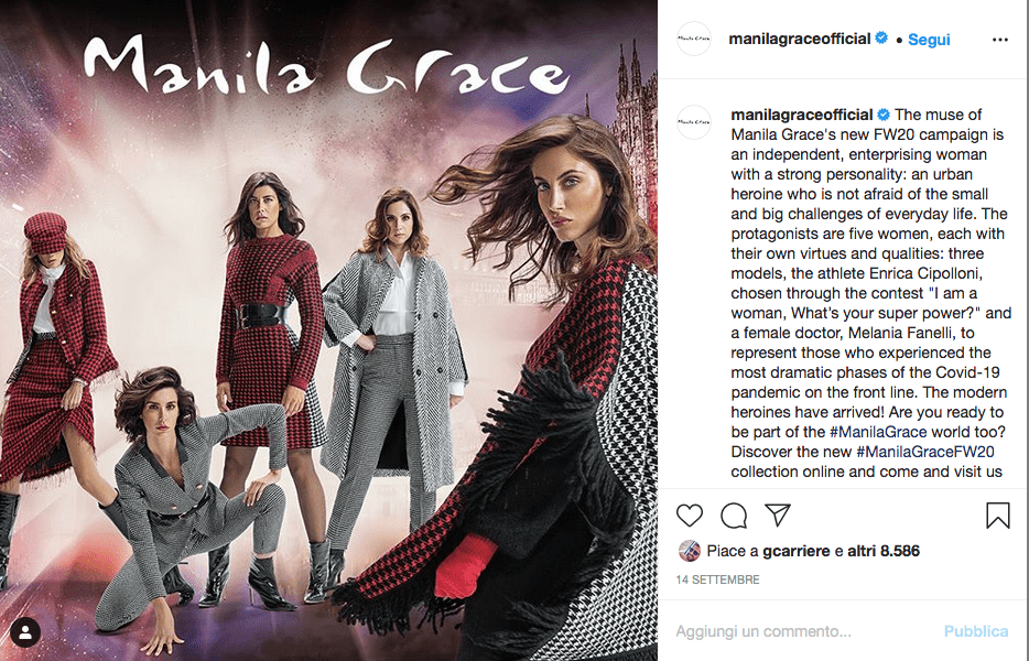 “La musa della nuova campagna FW20 di Manila Grace è una donna indipendente, intraprendente e dalla forte personalità – si legge sulla pagina ufficiale della casa di moda – una eroina urbana, che non teme le piccole e grandi sfide del quotidiano. Le protagoniste sono cinque donne, ognuna con le proprie virtù e qualità: tre modelle, l’atleta Enrica Cipolloni, scelta attraverso il contest “I am a woman, What’s your super power?” e una donna medico, Melania Fanelli, a rappresentare chi ha vissuto in prima linea le fasi più drammatiche della pandemia da Covid-19. Le eroine moderne sono arrivate!”.