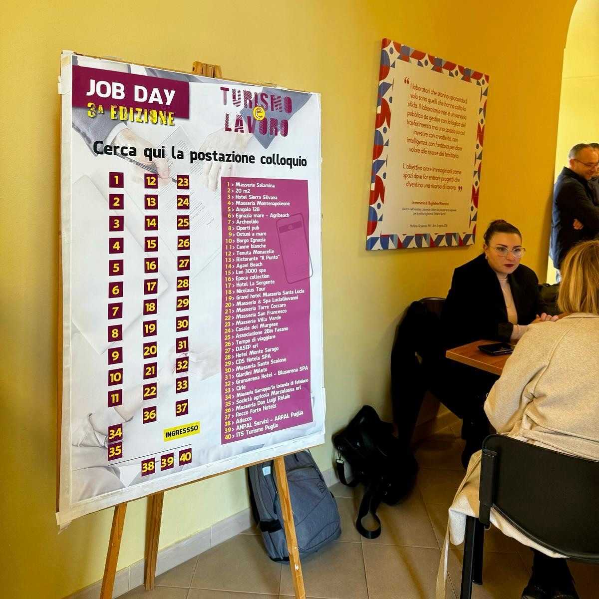 FASANO – Un numero elevatissimo di colloqui, circa mille a fine giornata, ha caratterizzato la terza edizione del Job Day, organizzata da Città di Fasano e Provincia di Brindisi con il patrocinio della Fondazione ITS Istituto Tecnologo superiore per l’industria dell’ospitalità e del turismo allargato, in collaborazione con Arpal Puglia, Fortis parco culturale, Sviluppo Lavoro Italia spa (già Anpal servizi) e Adecco.