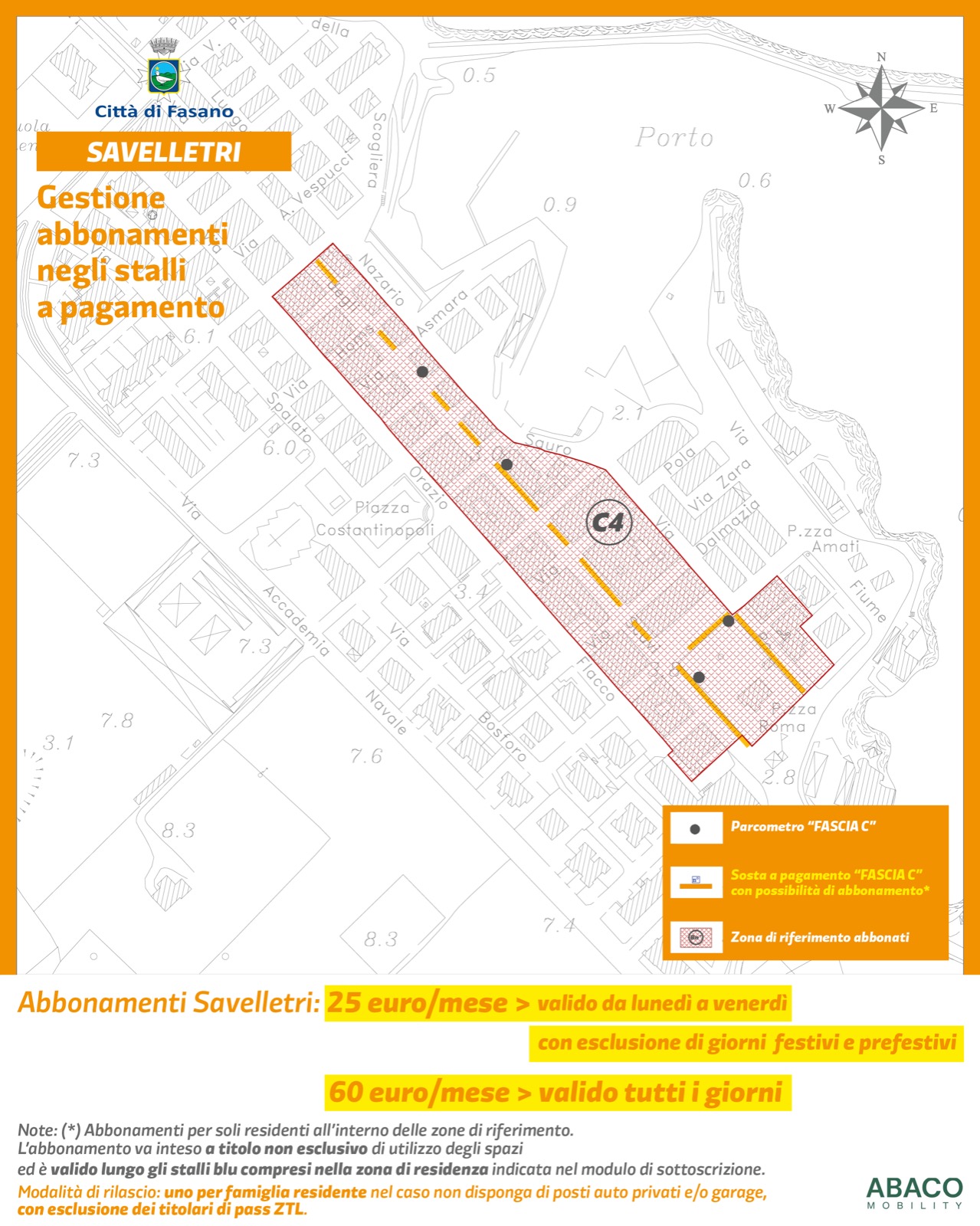 FASANO – Abbonamenti a costi agevolati per i residenti con possibilità di scelta tra più tipologie. Dall’accordo tra ABACO S.p.A., la società che gestisce le strisce blu del territorio, e il Comune di Fasano nasce una nuova modalità di abbonamento per Fasano centro, Pezze di Greco, Savelletri e Torre Canne.