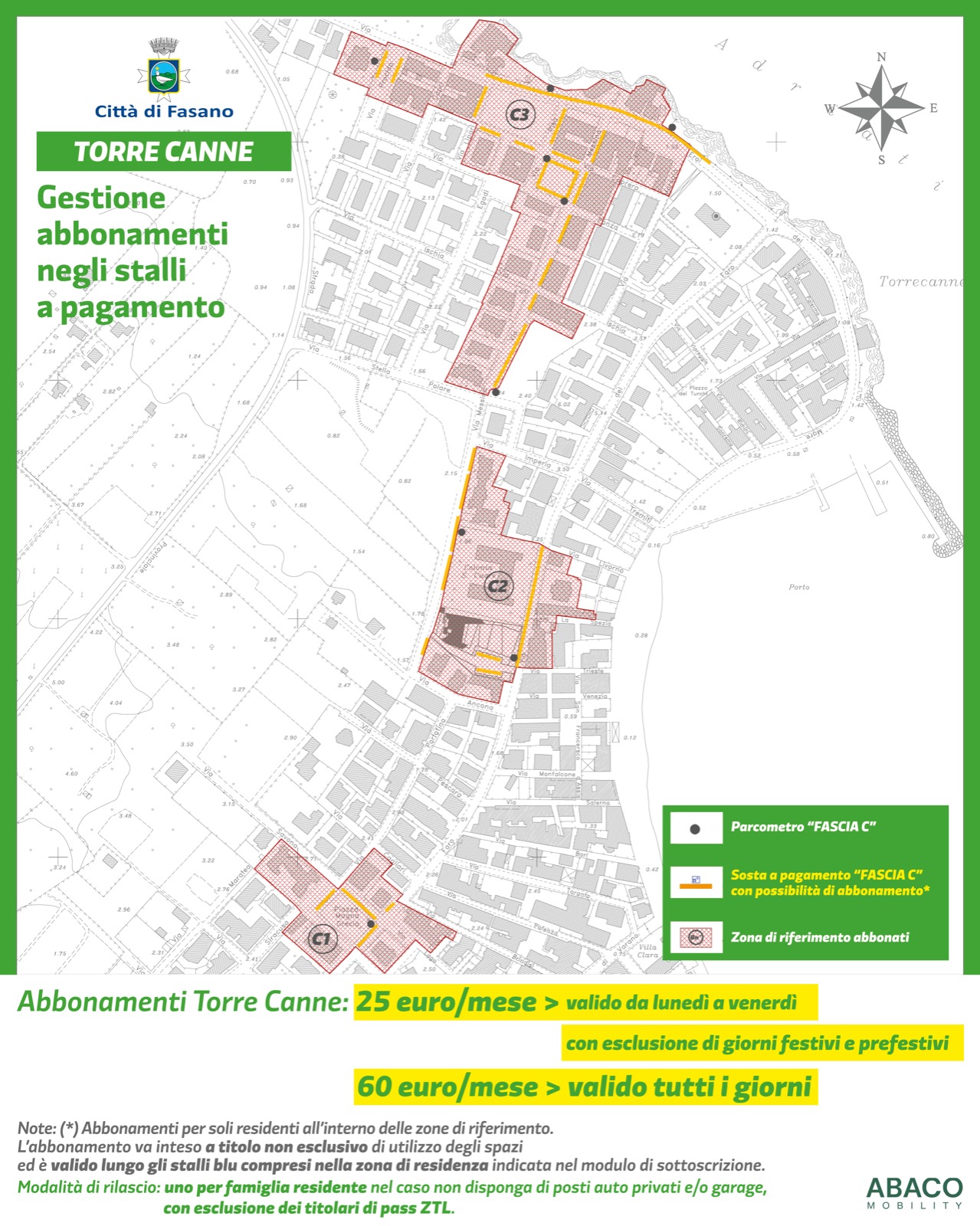 I costi variano da centro a frazioni. Per Fasano centro il prezzo dell’abbonamento è di 30 euro (valido tutti i giorni), per Pezze di Greco è di 25 euro (valido tutti i giorni); per le marine di Savelletri e Torre Canne è di 25 euro al mese (valido dal lunedì al venerdì con esclusione di giorni festivi e prefestivi) o di 60 euro al mese (valido tutti i giorni). Anche per le marine può essere rilasciato un solo abbonamento per famiglia residente nel caso non si disponga di posti auto privati e/o garage, con esclusione dei titolari di pass ZTL per la frazione di Torre Canne.