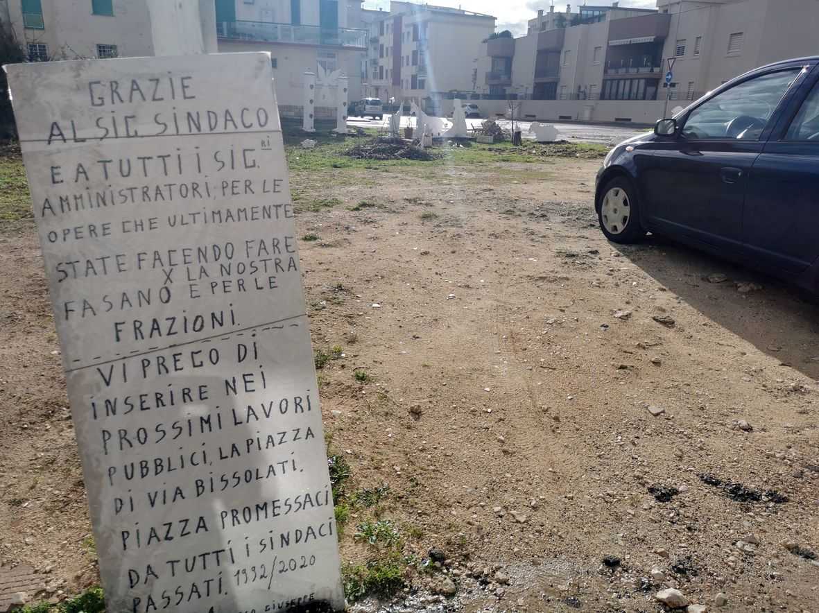 FASANO – “Grazie al sig. sindaco e a tutti i sig. amministratori per le opere pubbliche che ultimamente state facendo fare per la nostra Fasano e per le frazioni. Vi prego di inserire, nei prossimi lavori pubblici, la piazza di via Bissolati. Piazza promessaci da tutti i sindaci passati 1992/2020“. Questa è la frase che campeggia su un cartello sistemato da alcuni privati cittadini che risiedono in via Bissolati, riferendosi allo stato di degrado in cui versa piazza Salvatore Russi fin dal giorno della sua realizzazione.