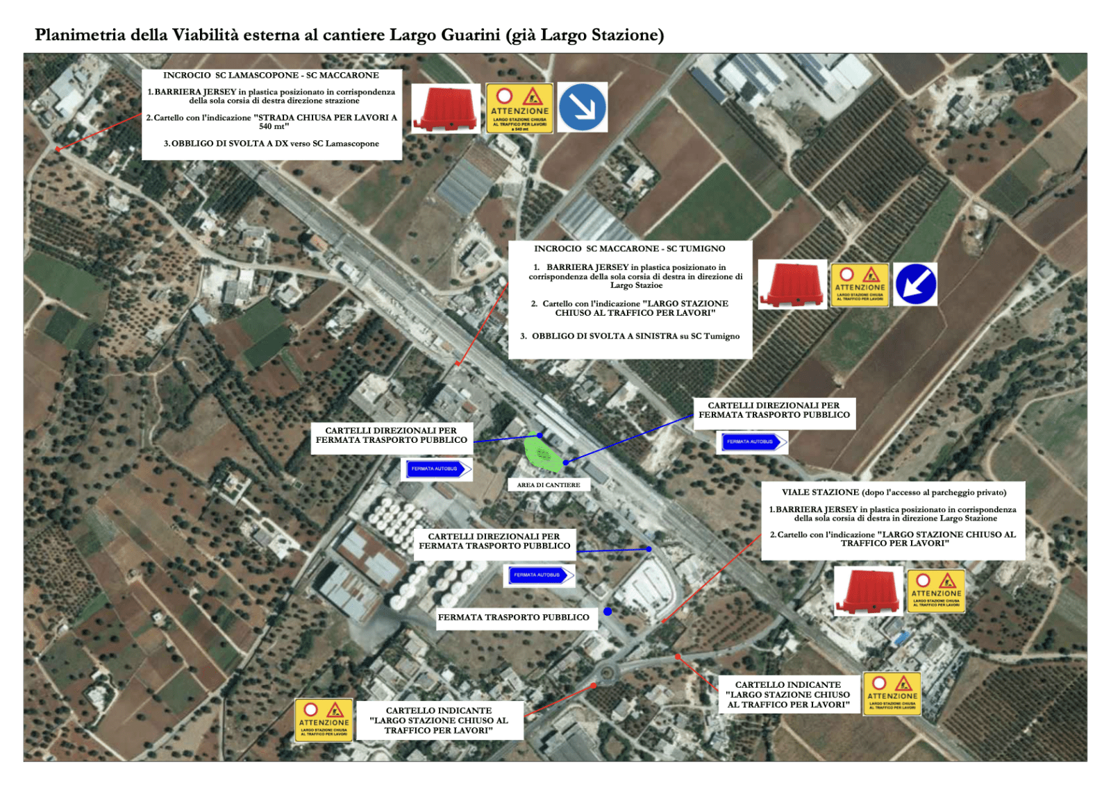 La viabilità sarà interdetta in viale Stazione all’altezza del parcheggio privato, ad eccezione dei residenti delle abitazioni prospicienti l’area di cantiere; in strada comunale Maccarone l’interdizione alla viabilità carrabile sarà posizionata in prossimità dell’incrocio con strada comunale Tumigno.