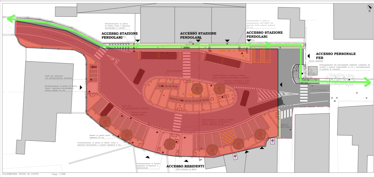 utenti-viaggiatori, provenienti sia da Viale Stazione e da Strada Comunale Maccarone, un percorso pedonale, delimitato da adeguata recinzione, in corrispondenza dell’esistente marciapiede nei pressi del Fabbricato Stazione.