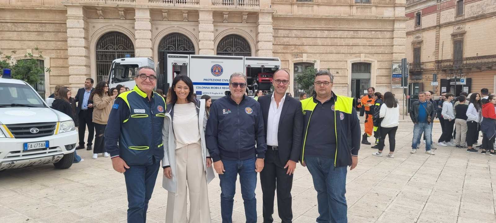 Presenti alla iniziativa il sindaco Francesco Zaccaria, l’assessore alla pubblica istruzione Donatella Martucci, il disaster manager comunale Angelo Decarolis, il presidente del Coordinamento provinciale di Protezione civile Giannicola D’Amico e il presidente del Comitato regionale di Protezione civile Maurizio Bruno.