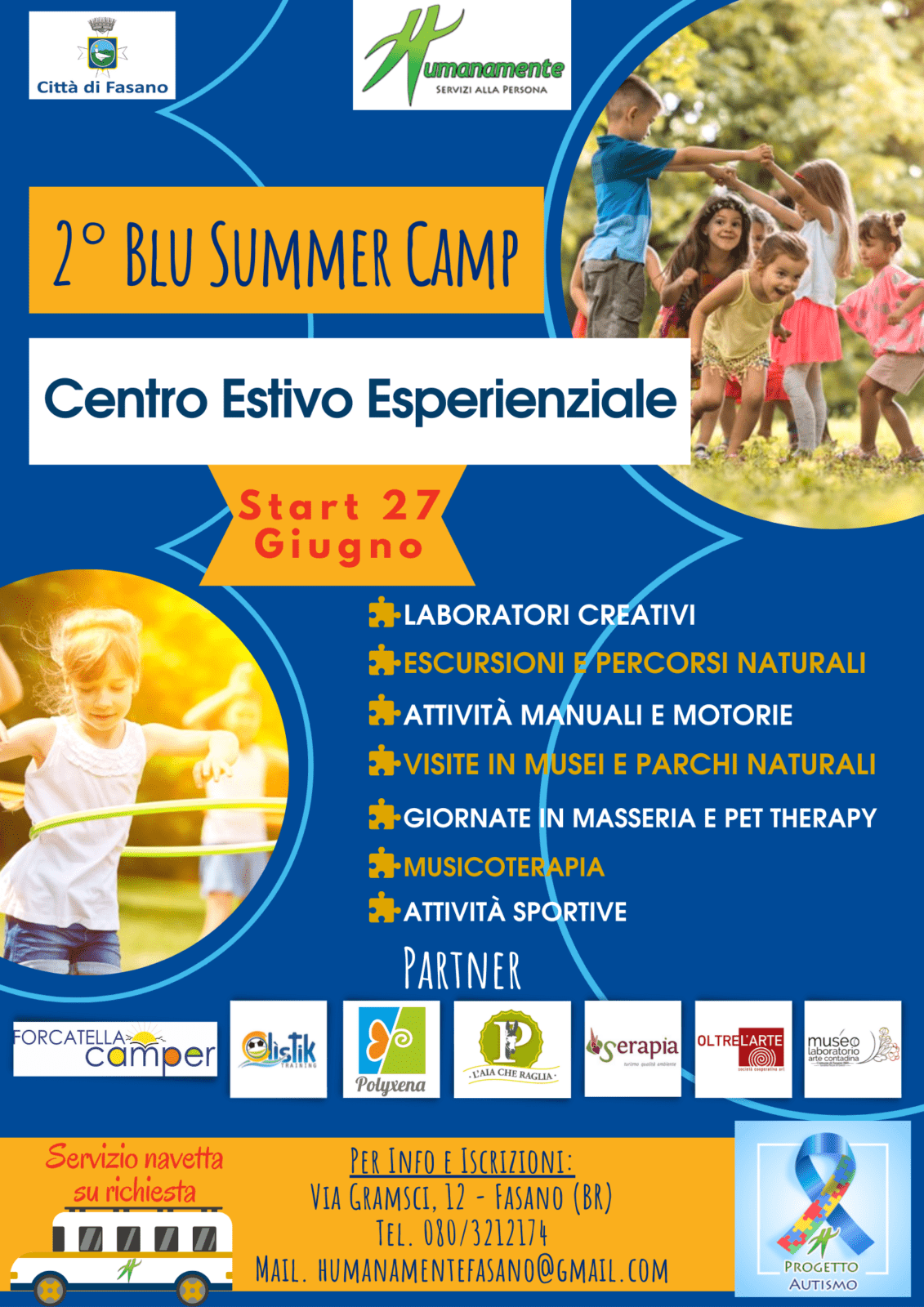 FASANO – Dopo il successo della prima edizione, anche quest’anno l’Associazione Humanamente di Fasano ripropone il “Blu Summer Camp”, il centro estivo dedicato interamente a bambini e bambine con Disturbo dello Spettro Autistico.