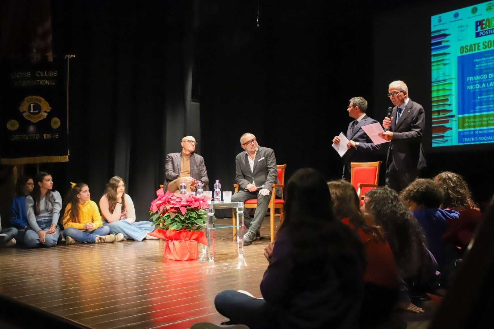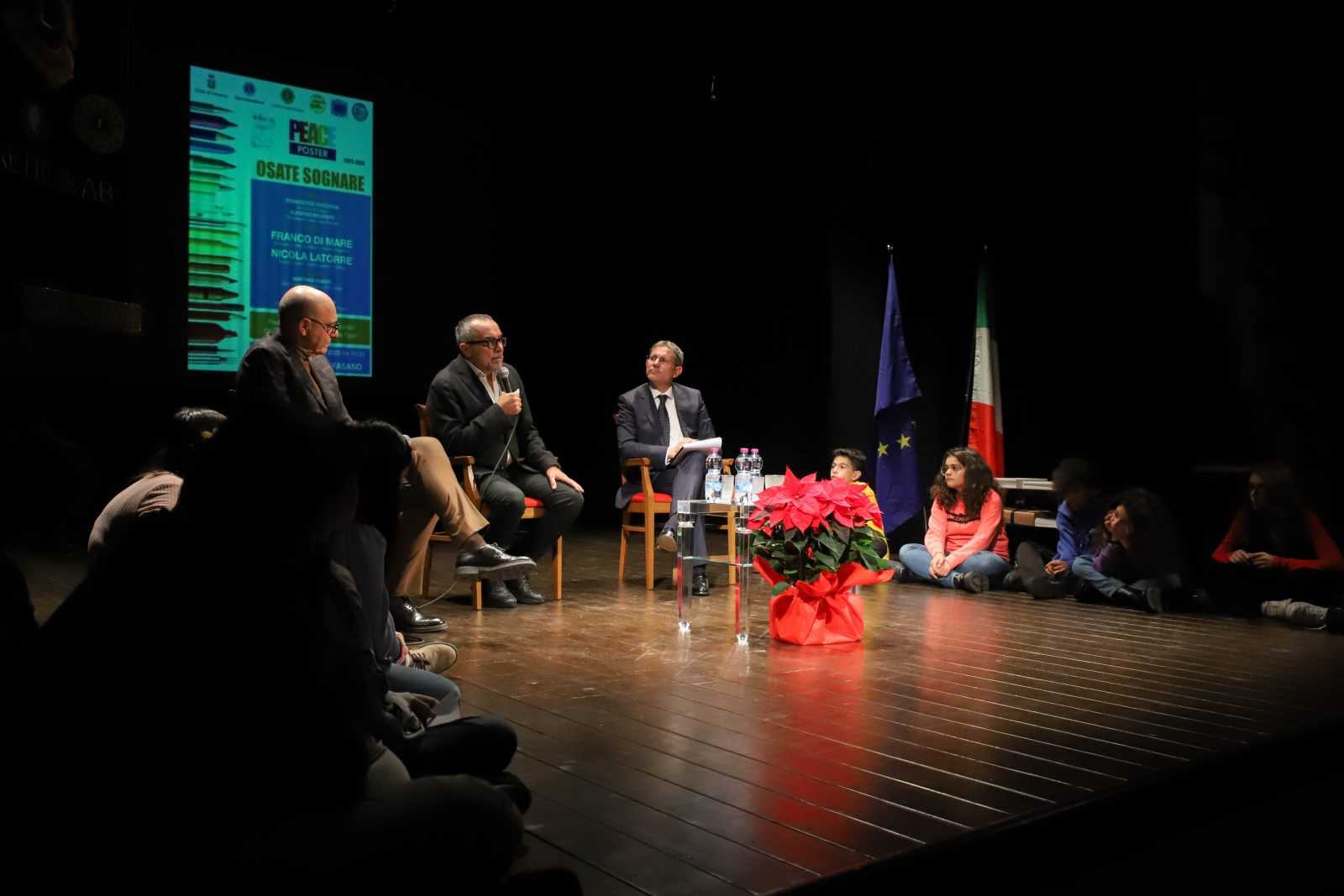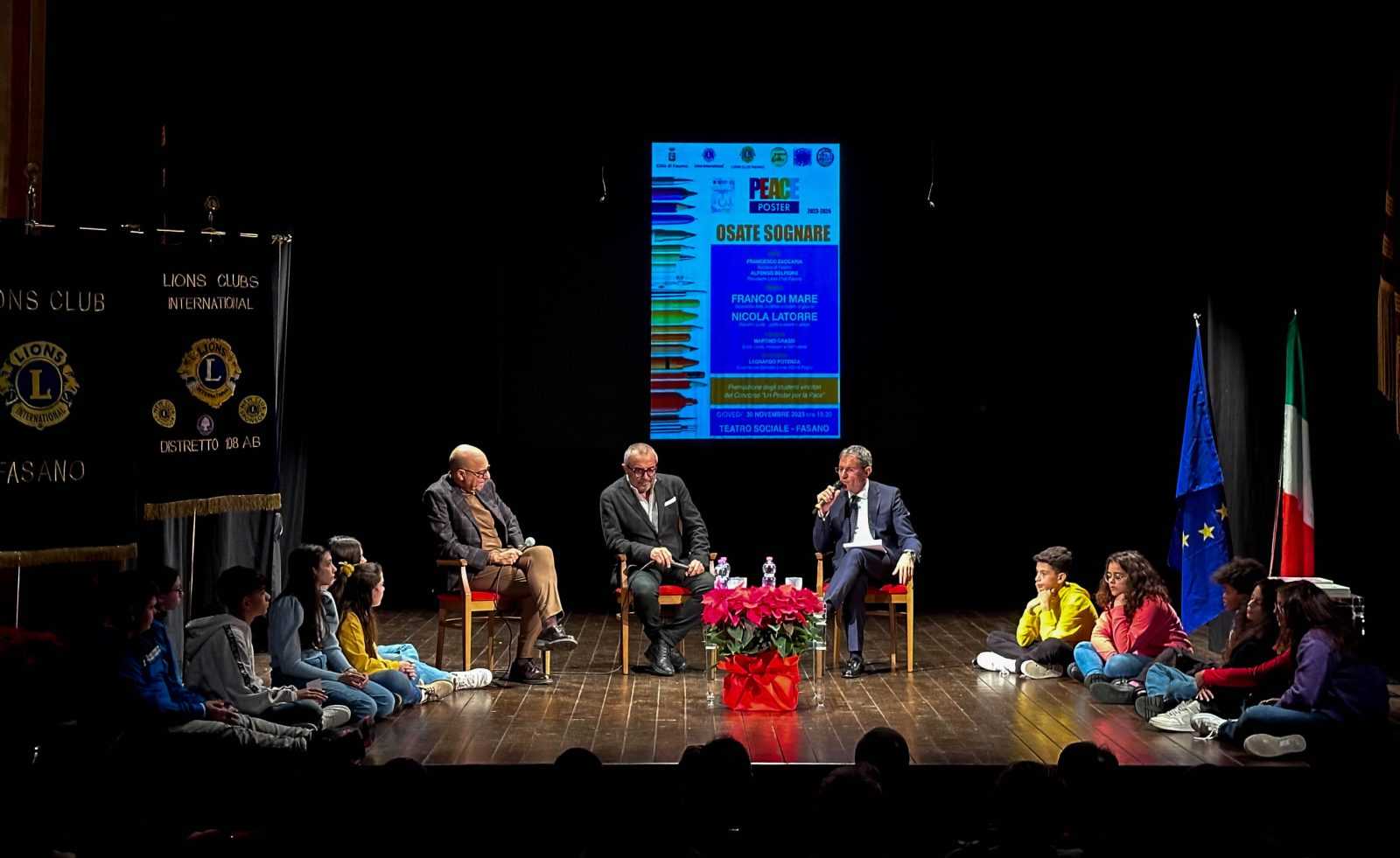Un appuntamento arricchito dalla presenza di due ospiti illustri: Nicola Latorre – già sindaco di Fasano e senatore, editorialista su giornali nazionali, già direttore generale dell’Agenzia Industrie Difesa e attualmente docente di politica estera e difesa presso l’Università LUISS “G. Carli” di Roma – e Franco Di Mare – tra i più noti giornalisti italiani, inviato di guerra, autore di libri, conduttore di trasmissioni di successo sui canali Rai, azienda in cui ha ricoperto prestigiosi incarichi dirigenziali. I due ospiti, anche grazie alle domande dei giovani studenti presenti sul palcoscenico, hanno offerto al numeroso pubblico interessanti spunti di riflessione facendo riferimento alla loro esperienza personale e professionale.