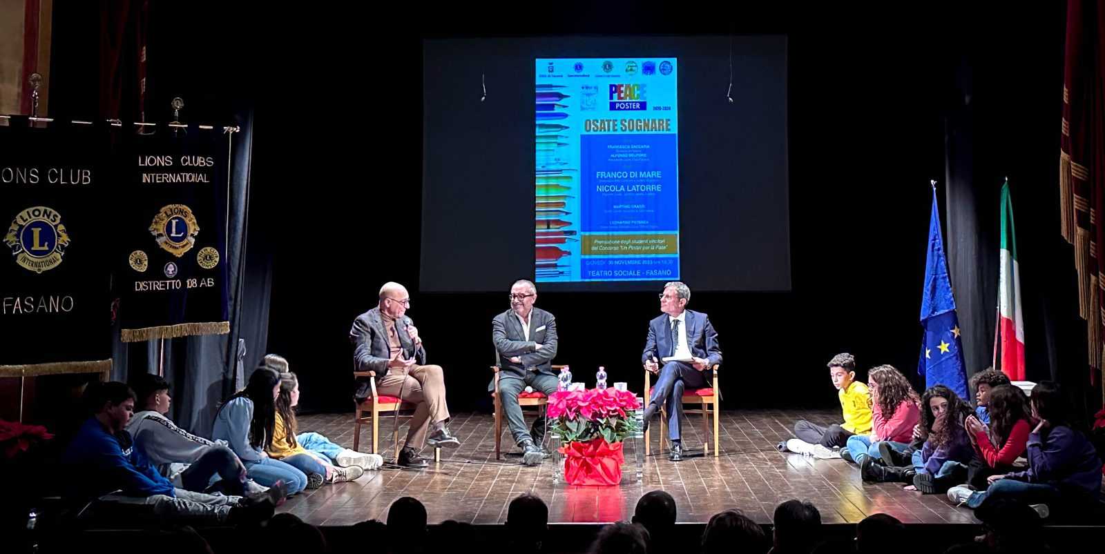 FASANO – Un’emozionante serata dedicata ai giovani ed alla pace si è vissuta giovedì 30 novembre presso il teatro Sociale di Fasano, organizzata dal Lions Club Fasano che ha premiato gli studenti che hanno partecipato al concorso internazionale “Un poster per la pace” che da oltre 30 anni i Lions organizzano a livello mondiale.