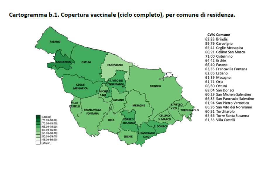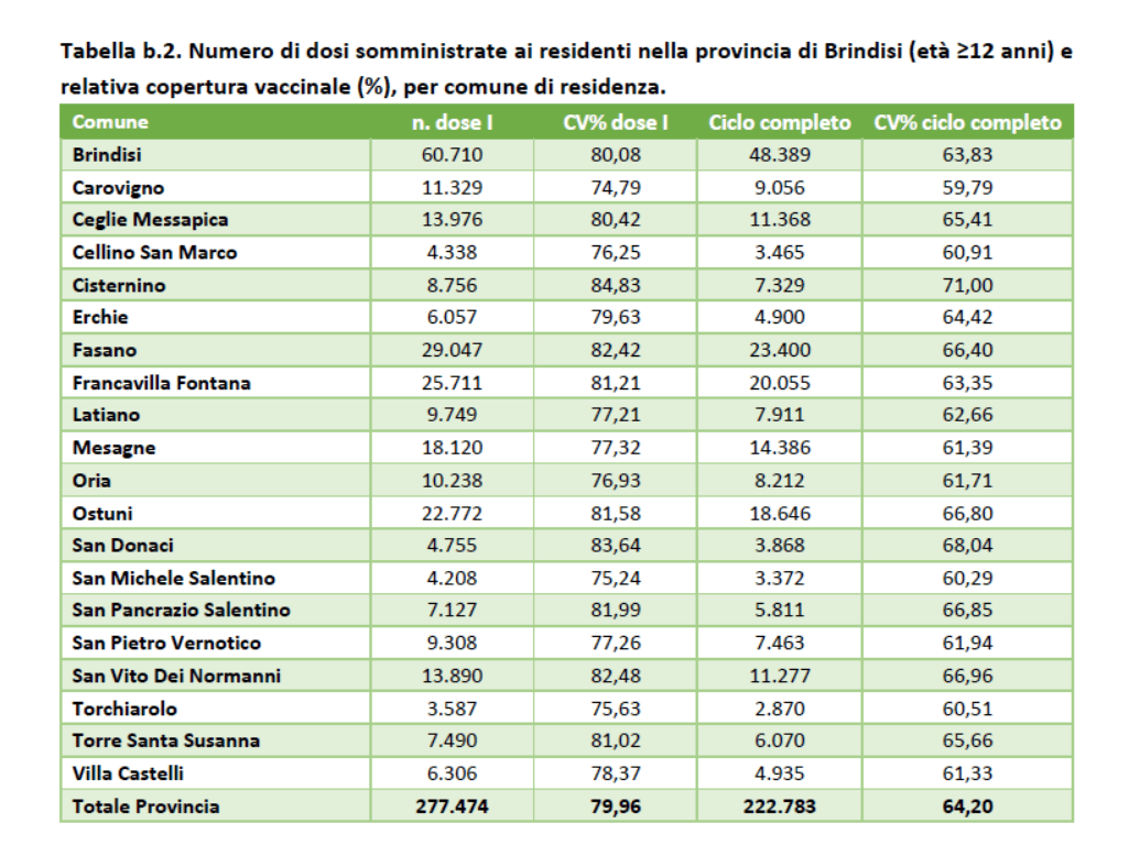 Fino al 19 agosto i residenti o domiciliati in provincia di Brindisi vaccinati con la prima dose sono 277.474 e di questi 222.783 con la seconda dose, con una copertura vaccinale pari rispettivamente all’80% e al 64,2%. La copertura vaccinale con la prima dose relativa ai residenti con piĂą di 80 anni di età è pari al 95,2% e al 91,5% per il ciclo completo.