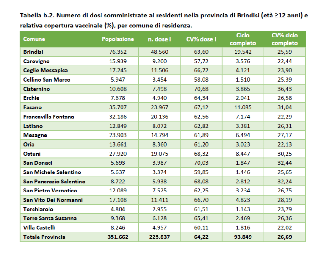 Fino al 24 giugno i residenti o domiciliati in provincia di Brindisi vaccinati con la prima dose sono 225.837 e di questi 93.849 con la seconda dose, con una copertura vaccinale pari rispettivamente al 64,2% e al 26,7%.