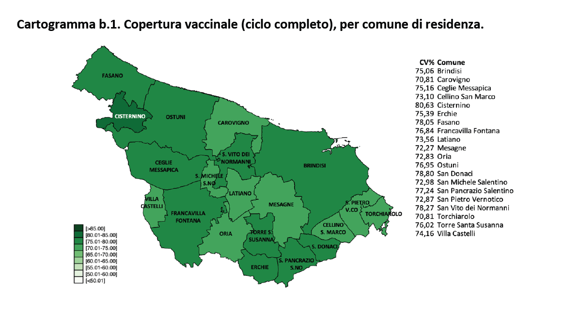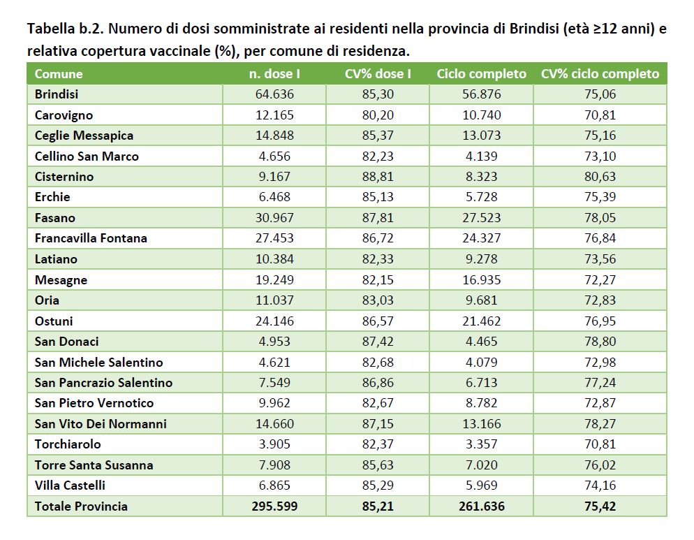 Fino al 30 settembre i residenti o domiciliati in provincia di Brindisi vaccinati con la prima dose sono 295.599 e di questi 261.636 con la seconda dose, con una copertura vaccinale pari rispettivamente all’85,2% e al 75,4%. I residenti affetti da patologia immunodepressiva vaccinati con terza dose sono 1.059. La copertura vaccinale con la prima dose relativa ai residenti con più di 80 anni di età è pari al 96,3% e al 92,7% per il ciclo completo.