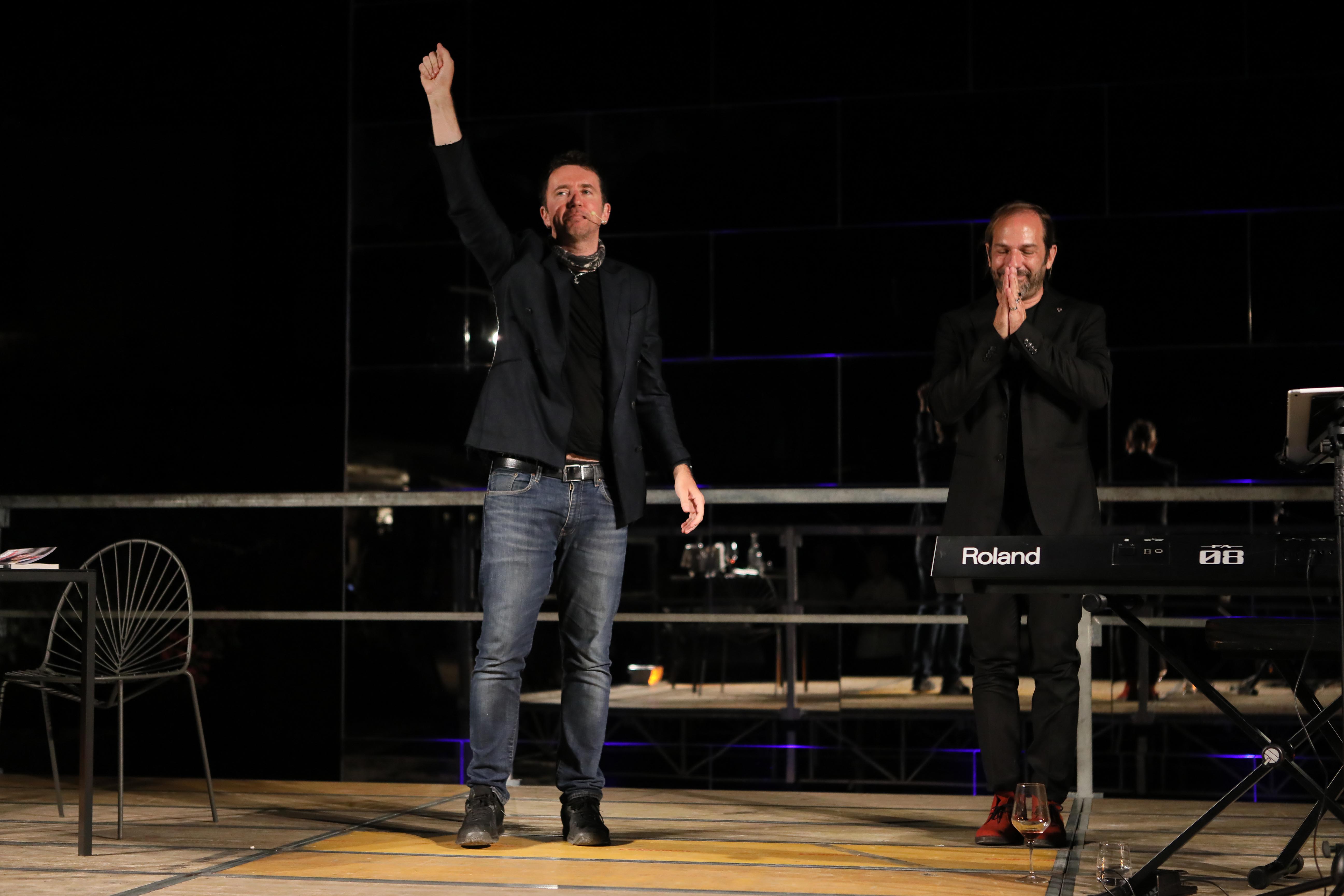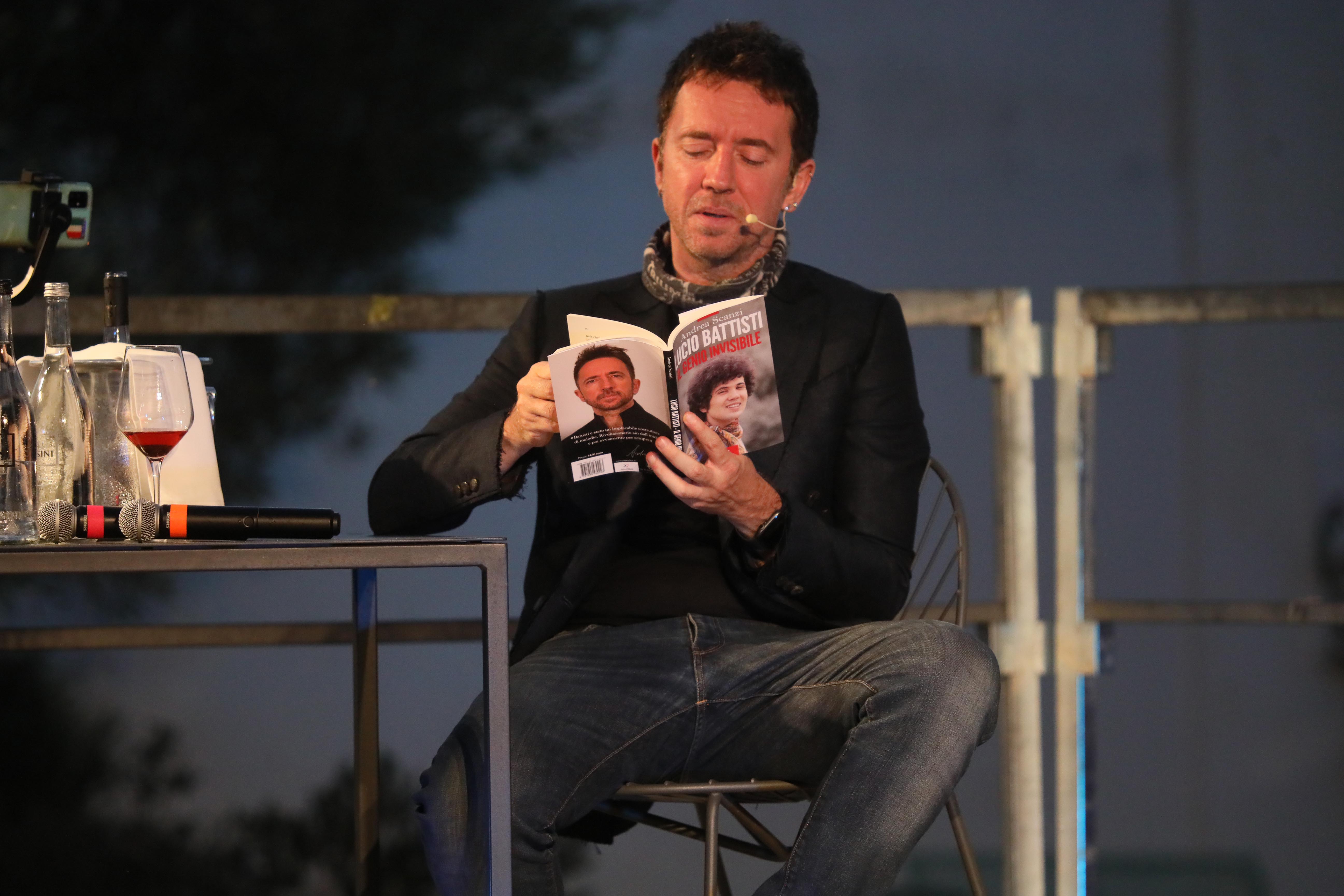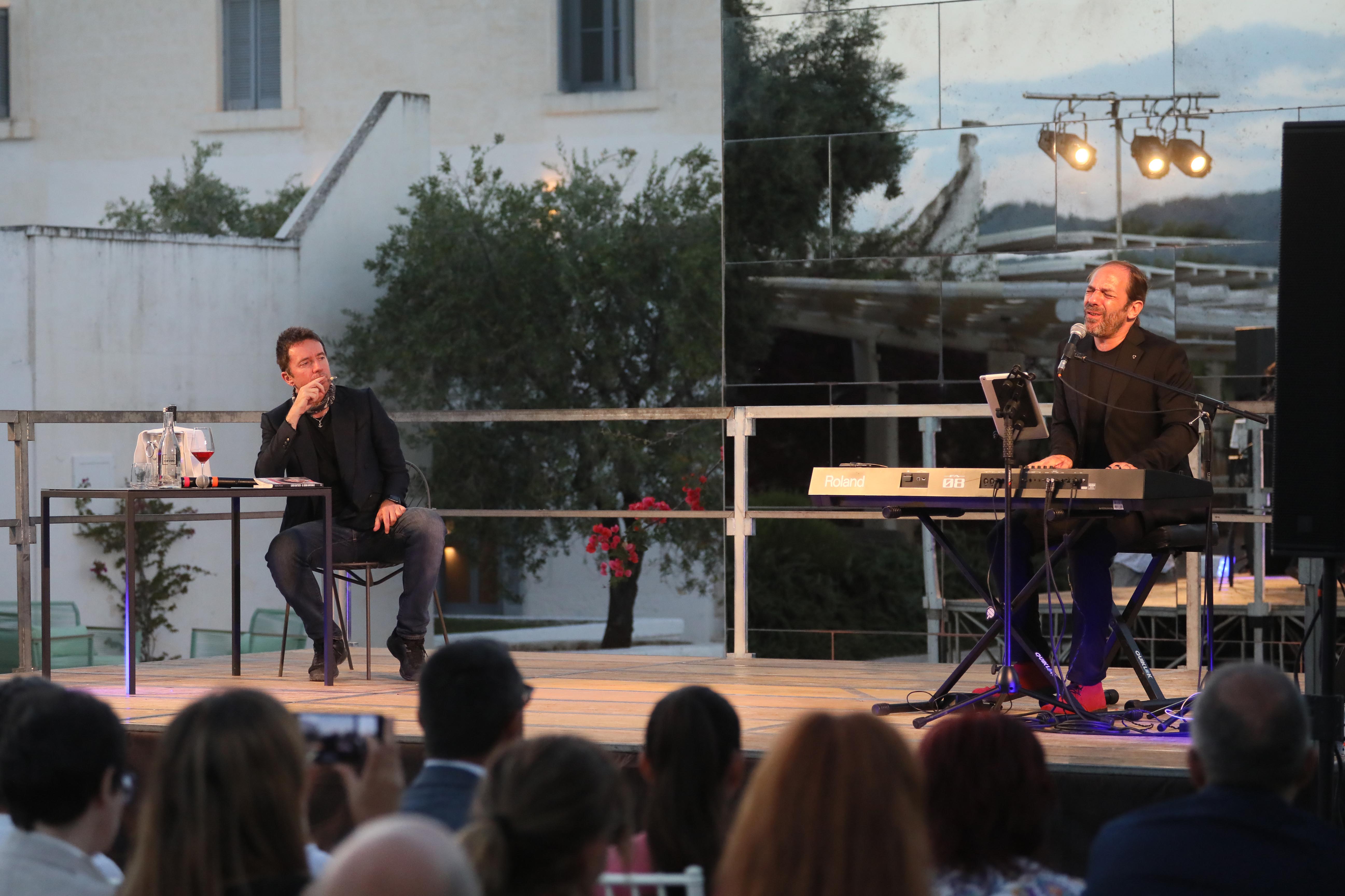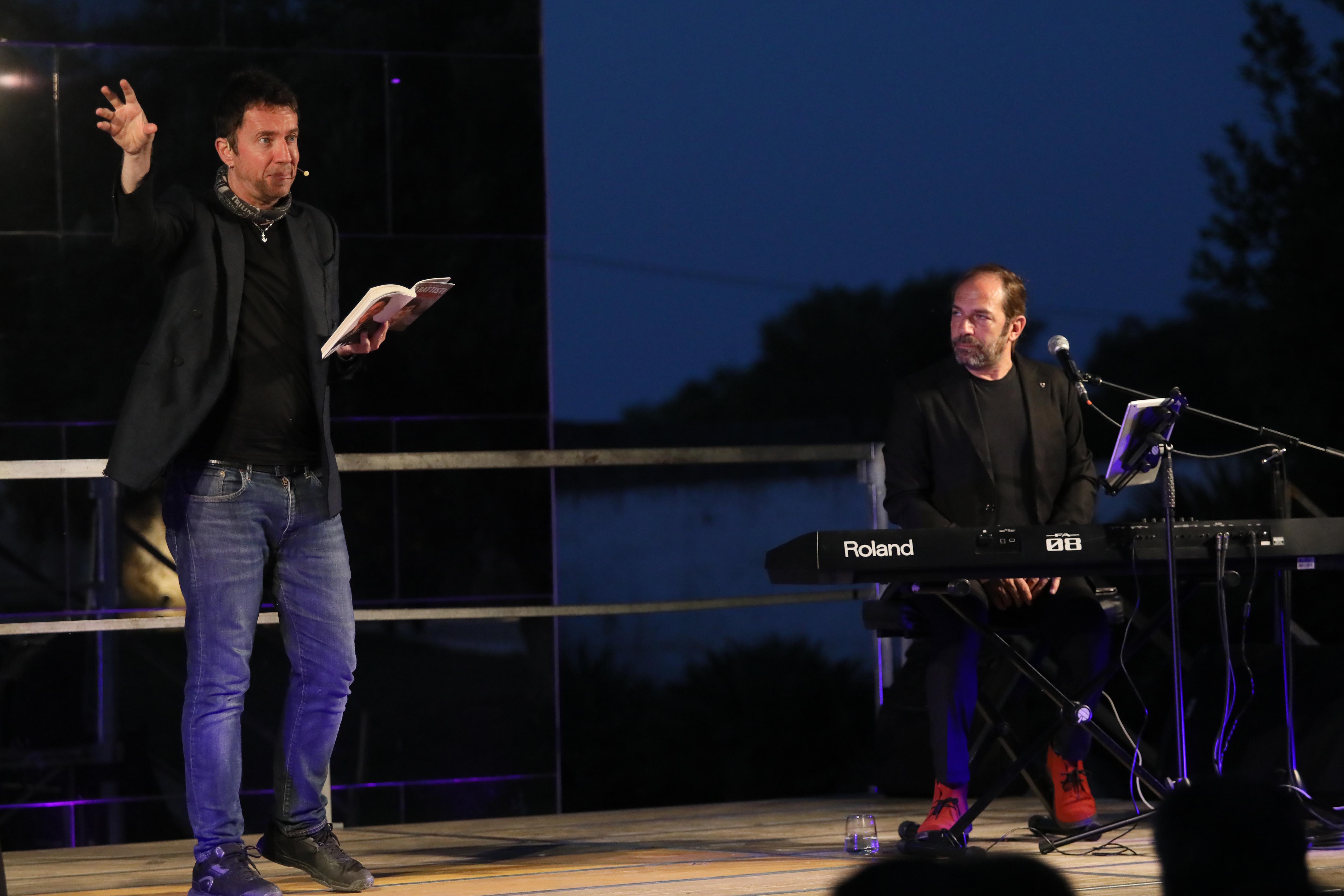 Ad accompagnare Scanzi sul palco, allestito nel parco della suggestiva Masseria San Giovanni, il cantante e musicista pescarese Gianluca Di Febo, frontman dei Terzacorsia.