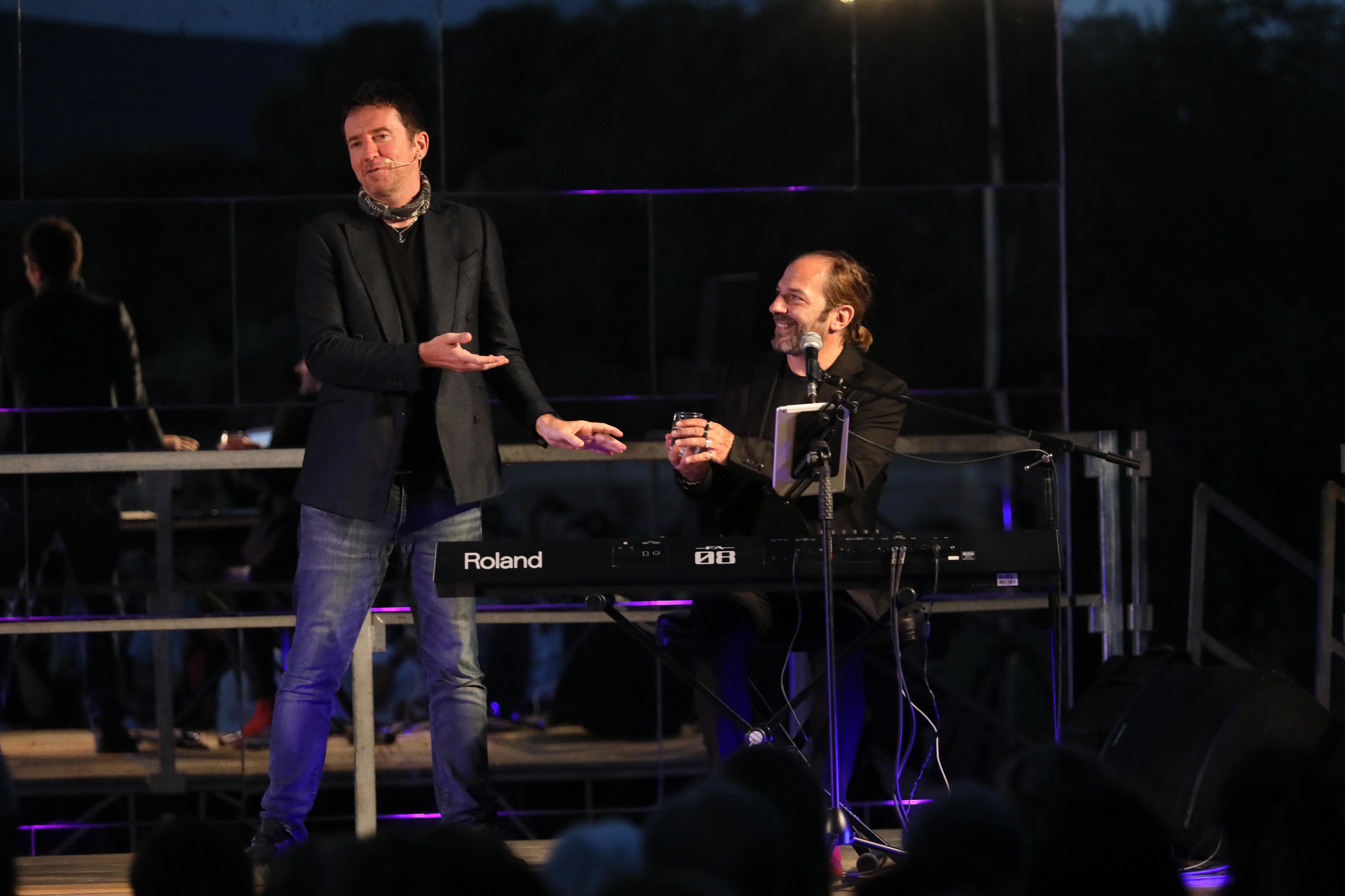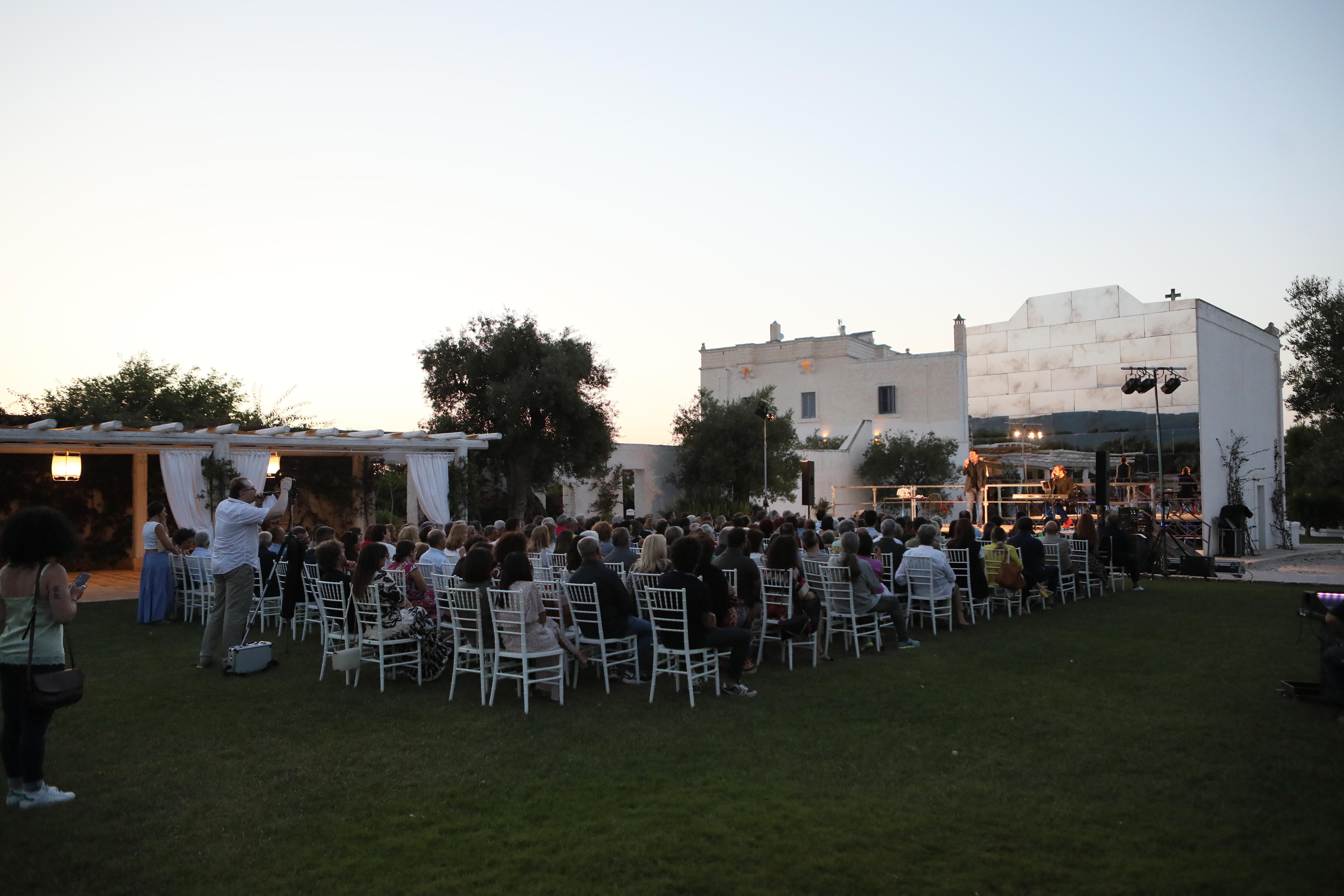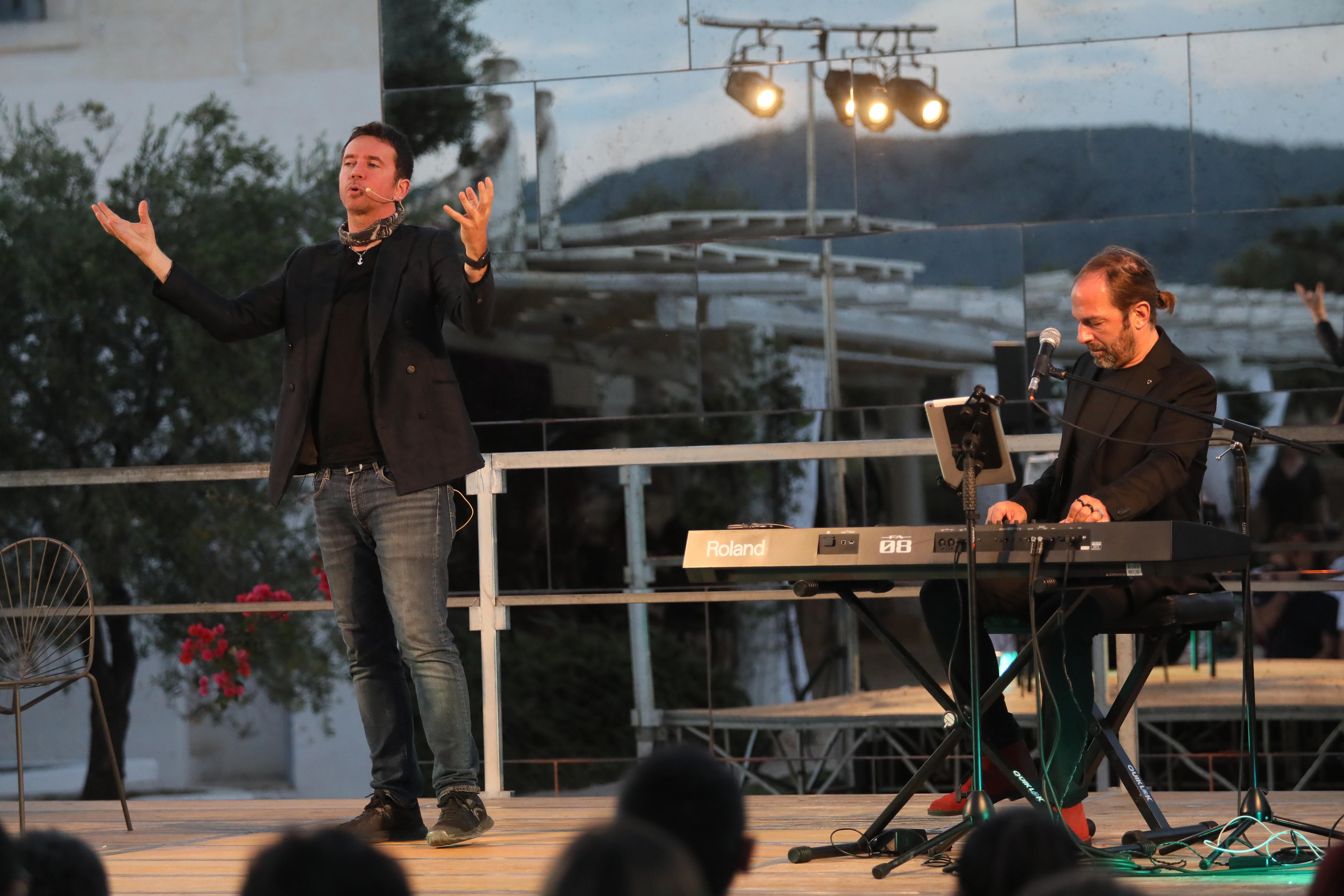 Ad accompagnare Scanzi sul palco, allestito nel parco della suggestiva Masseria San Giovanni, il cantante e musicista pescarese Gianluca Di Febo, frontman dei Terzacorsia.