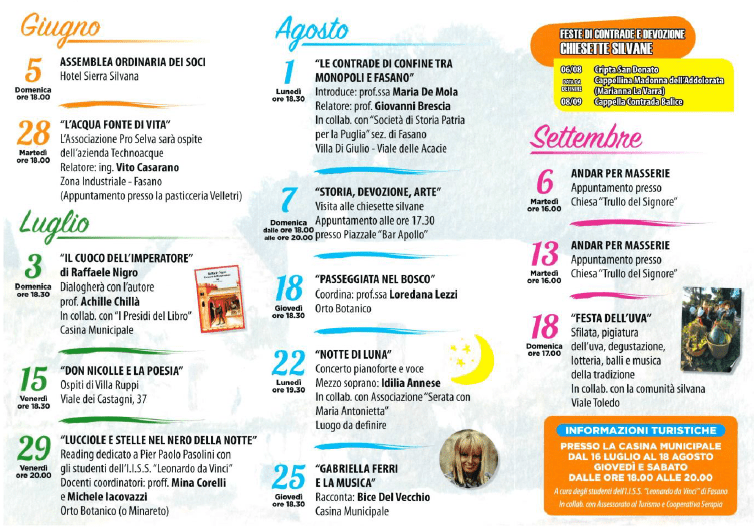 FASANO – “Selva di Fasano – dove la cultura unisce” è il titolo del programma di manifestazioni estive 2022 messe a punto dall’Associazione Pro Selva, il sodalizio che da oltre trent’anni si batte per la tutela e la valorizzazione della collina fasanese.