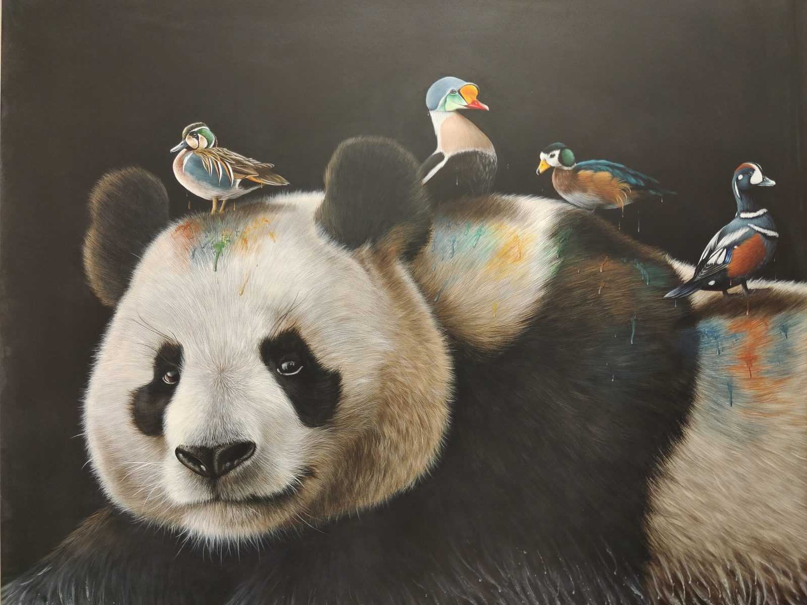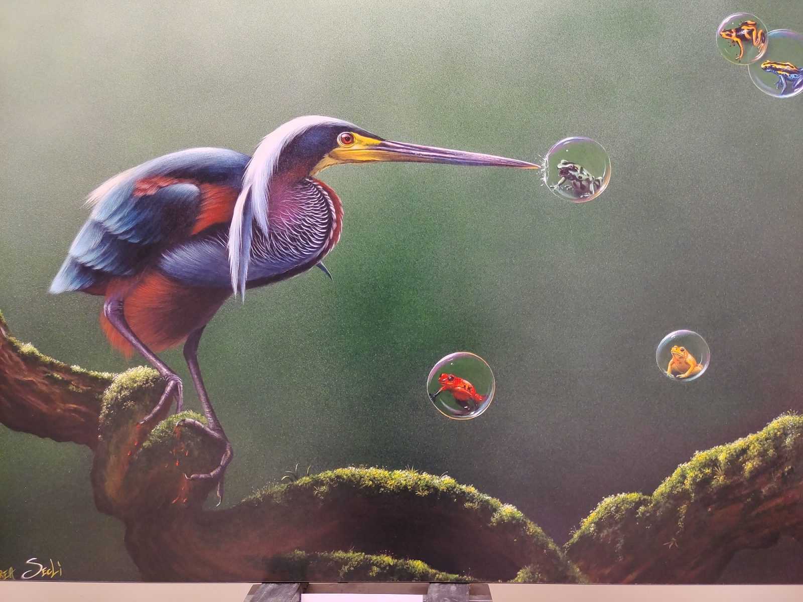 “Nella collezione ‘Colors of bird’ – afferma Seclì -, ho rappresentato varie specie di volatili, per la maggior parte poco conosciute e molte in via di estinzione, raffigurandole sul dorso di mammiferi altrettanto minacciati ma più noti e per questo più adatti a sensibilizzare uomini e donne sul tema del rischio della loro progressiva scomparsa. Nei dipinti della collezione ciascun volatile sembra quasi sciogliersi e macchiare di sé l’animale su cui si è posato, evocando così il gravissimo e attuale problema del surriscaldamento globale e dei rischi ad esso connessi.